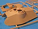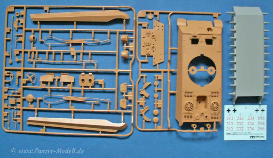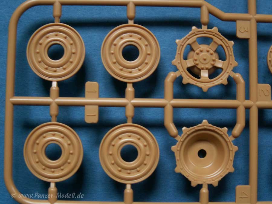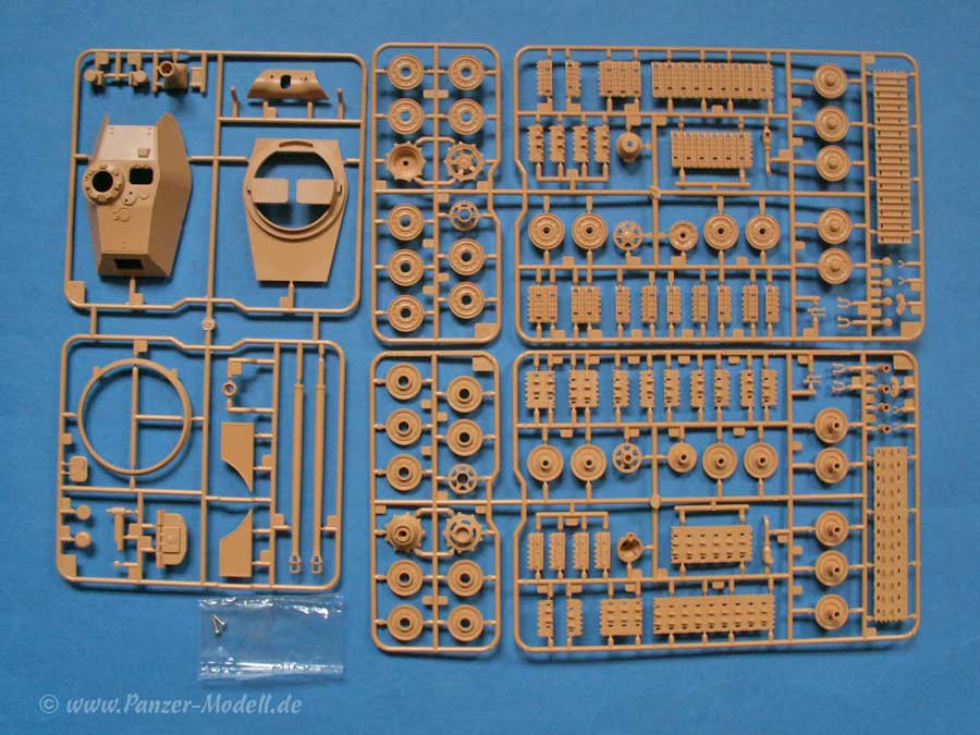Wie mittlerweile in dieser Reihe gewohnt, finden sich hier bemerkenswert gut detailierte Teile mit schönen Details. Dss Treibrad ist vom Typ mit den 9 Zähnen, und die Kette entsprechend zweiteilig in verschieden langen Segmenten. Gerade im Bereich des Laufwerks zeigen sich besonders gute Qualitäten. Aber auch der Turm und die lange Kanonen sind sehr schön dargestellt. Das Motordeck verfügt zwar über eine Vertiefung für einen Motor, der ist aber leider nicht enthalten.