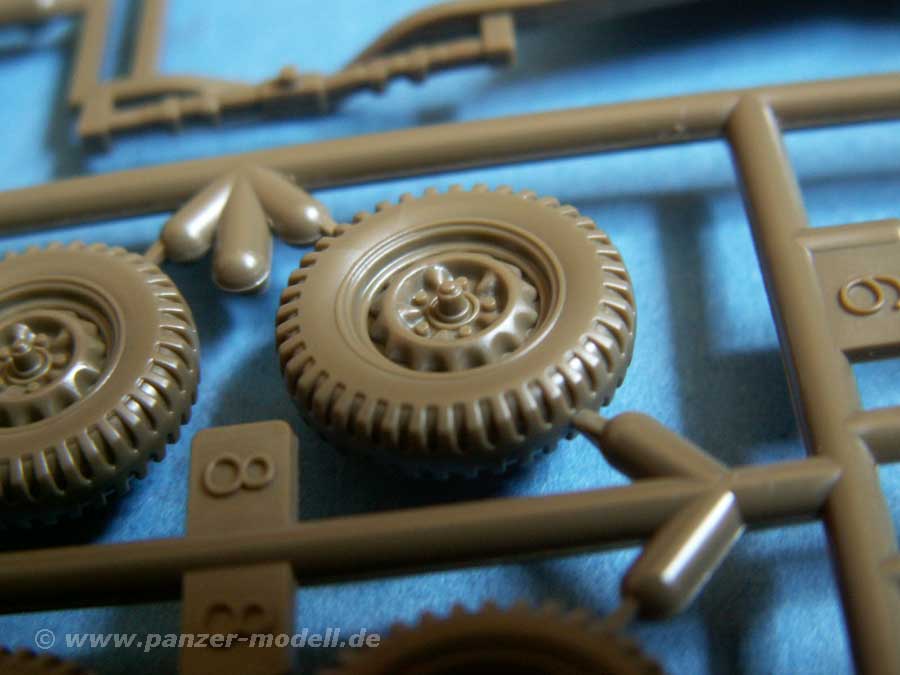 Die Spritzgussteile am Spritzling machen einen exzellenten Eindruck mit feinen Details. Die Reifen mit Felgen und Profil gefallen ebenso, wie die fein modellierten Sitze, der Aufbau und die übrigen Kleinteile - an dieser Detailqualität könnten sich so manche 1/35 Bausätze eine Scheibe von abschneiden.