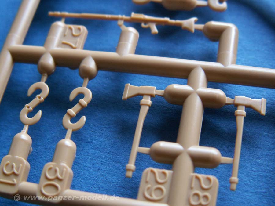 Ebenfalls schön, die beigabe von entsprechenden Figuren um Leben in das Fahrzeug zu bringen - wer den 1/35 Satz kennt, dem werden auch diese Figuren bekannt vorkommen. Schön, das diese quasi ohne merkbaren Detailverlust in diesem Ma0stab gebracht wurden. Auch das Werkzeug weiss in dieser Größenklasse zu gefallen!