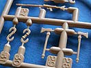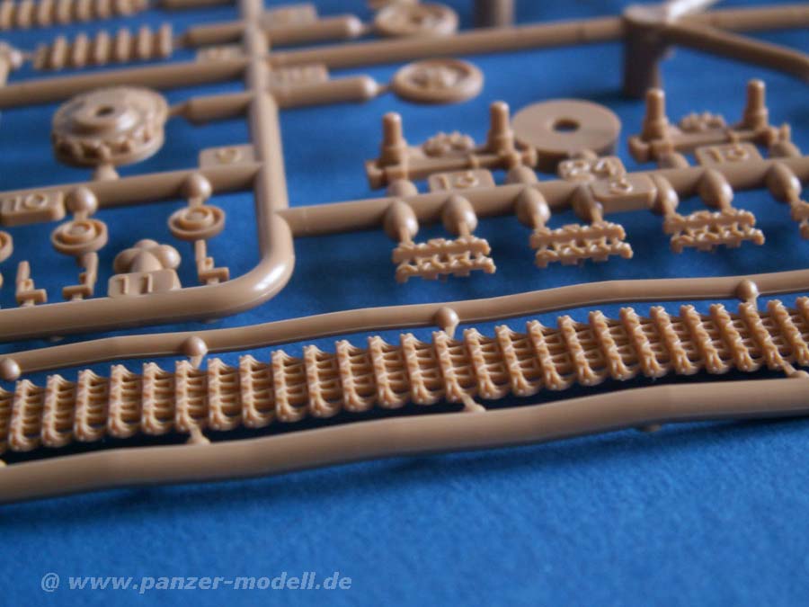 Die Spritzgussteile am Spritzling machen einen sehr guten Eindruck mit feinen Details. Die Kette besteht aus verschieden langen Segmenten, wobei der obere Teil bereits den Kettendurchhang zwischen den Stützrollen beinhaltet.