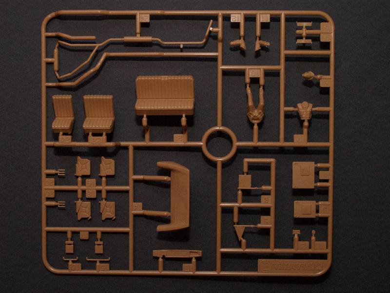 Enthalten sind 3 Spritzlinge auf beigefarbenen Plastik, ein Spritzling aus transparenten Plastik, der Fahrzeugrahmen aus Metall und ein Decalbogen.