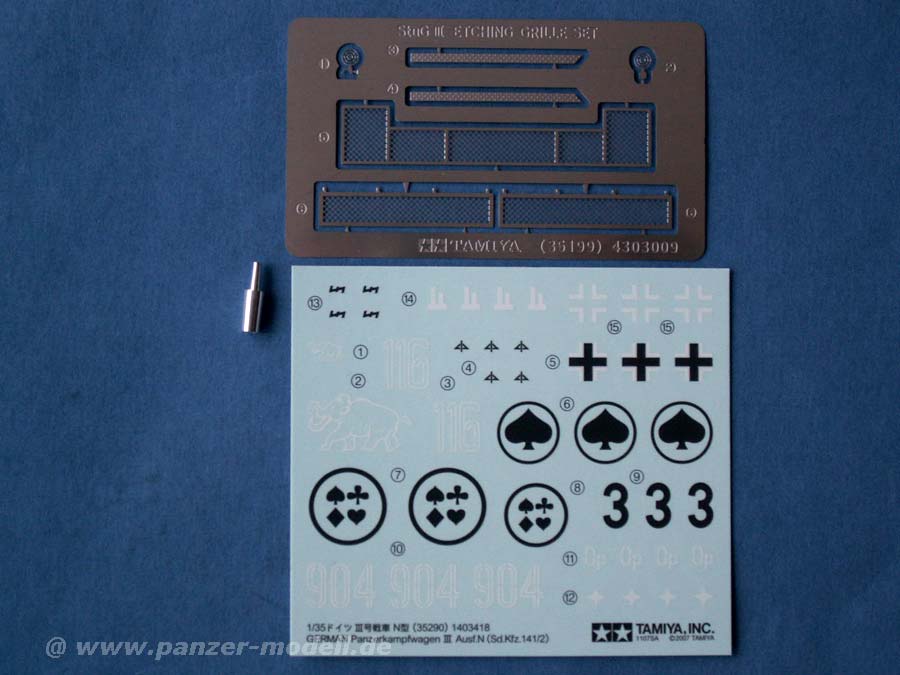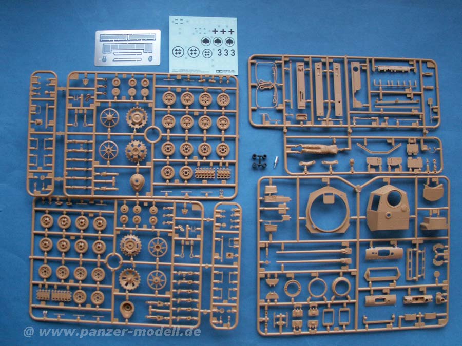 Im Vertrieb von Dickie-Tamiya ![]() In bester Tamiya-Manier finden sich im Karton 6 Spritzlinge, die Unterwanne, Vinylketten, PE Teile, ein Alu-Rohr und natürlich ein Decal Bogen. Tamiya geht den eingeschlagenen, guten Weg, weiter und spendiert den Bausätzen jetzt gleich einen Basis PE Satz, der hier die Lüftergitter umfasst und in diesem Fall sogar ein schickes Alu-Rohr. Die Spritzguss-Teile sind sehr schön und extrem sauber, wie man es von Tamiya gewohnt ist. Alle Teile sind neu entworfen und kein Wiederaufguss alter Bausatzteile!Die Detailierung kann mal als gut bezeichnen, wennauch im direkten Vergleich z.B. der Cyber Hobby Bausatz der Panzer III N stellenweise noch detailierter ist, wie z.B. die Senkkopfschrauben im Turmdach oder die Aufdrucke auf den Laufrollengummis. Die Vinylketten sehen sehr gut aus, lassen allerdings leider keinen Kettendurchhang zu, wie es mit Einzelgliedketten möglich wäre. Positiv fällt wieder auf, dass Tamiya verschiedene Versionen des Panzer III N möglich macht (wennauch nur in Details) und vor allem Kommandantenfiguren (2 Stück) beilegt - etwas das vielen anderen Herstellern noch fehlt! Die Schwingarme werden einzeln in die Wanne eingesetzt und bieten somit auch die Möglichkeit Unebenheiten eines Dioramas einzuarbeiten. Zudem kann die Wanne mit oder ohne seitliche Notausstiegsluken gebaut werden. Der Panzer basiert übrigens auf der Wanne ohne den Tiefwat-Auspuff - schade dass man dies nicht als Optionsteile beigelegt hat. Alle Luken - auch die des Motorraums - sind offen darstellbar, auch wenn es keinen Innenraum dahinter gibt - nur der Turm weist rudimentäre Inneneinrichtung auf mit dem Innenleben der Kanone. Die Kanone an sich ist als Alurohr ausgeführt mit Feldern und Zügen - exzellent. Die Bauanleitung ist sehr gut und verständlich ausgeführt, wie man es von Tamiya gewohnt ist - hier sollte es absolut keine Probleme geben, ganz besonders weil auf verschiedene Versionen und deren Optionsteile explizit hingewiesen ... bei anderen Herstellern leider nicht unbedingt gang und gäbe ist. Ausserdem wird mit viel Zusatzinformationen (mehrsprachig) zum Panzer und den Einheiten aufgewartet. Die Bemalungs/Markierungsanleitung steht mit drei Markierungsvarianten zur Verfügung: - 1.Kp, sPz.Abt.502 Leningrad, Winter 1942-43 - 8.Pz.Rgt., 15.Pz.Div. Tunesien, 1943 - 11.Pz.Rgt., 6.PzDiv., Kursk, Sommer 1943 Eine schöne Auflage dieses charismatischen Panzer III mit tamiya-typischer, super Passqualität und guten Details. Kostenpunkt etwa 42 Euro - nicht billig, aber immer noch um einiges billiger als das Cyber-Hobby Pendant. Das Modell ist bei dem Modellbaufachhändler eures Vertrauens zu bekommen. |