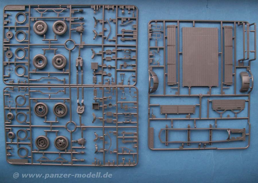 Im Vertrieb von Dickie-Tamiya ![]() Dahinter verbirgt sich natürlich nichts anderes als der 4x2 Opel Blitz - aus markenrechtlcihen Gründen bzw. um Lizenzgebühren zu vermeiden wird im bausatz auf die Verwendung dieses Namens verzichtet und dies findet leider seienn Weg auch auf den Namenszug der eigentlich von am Kühlergrill zu finden ist - auf dem Deckelbild bereits leer gibt es auch im Bausatz nur ein passendes Plastikteil ohne Aufdruck - hier sicher nur eine Frage der Zeit, bis ein PE Hersteller die entsprechenden Schilder bietet! Im karton finden sich 6 Spritzlinge, ein Spritzling mit Klarsichtteilen, Polycaps, Maskierfolien(!) und natürlich ein Decal Bogen. Die Qualität ist durch die Bank hervorragend, so wie man es von Tamiya gewohnt ist - die Dezailierung der Teile weiss zu gefallen, sogar die sitze sind derart gestaltet, dass feine Wüöste und Falten die Polsterung erkennen lassen. Dazu fein detailierte frühe Reifen mit 6-Loch Felge aus Spritzguss - zwar ohne Herstelleraufdruck, aber schön gestaltet. Dazu gibt es zwei Figuren die mit unterschiedlcihen Armen und zwei verschiedenen Köpfen zu Fahrer und Beifahrer gebaut werden können. Besonders schön gestaltet ist die Ladefläche mit ihrer Holzstruktur - diese ist echt fein und realistisch gestaltet. Allerdings finden sich hier an den Seitenwänden der Pritsche Auswerferstellen, die eben diese Holzstruktur unterbrechen - das ist wirklich bedauerlich und vom Modellbauer kaum zu korrigieren - dies ist der einzige wirklich Minuspunkt, den ich an diesem Modell finden kann. Zwar passt die Doppelblattfeder hinten nicht zu den frühen Reifen, dies kann man aber schnell mit einem geschickten schnitt zu einer einfach Blattfeder korrigieren, bzw. wird es sicher flugs auch späte Reifen geben. Als Gimmick gibt es zwei Spritzlinge mit 200l Fässern und Kanistern, die als Beladung dienen können - besonders die Fässer machen einen unheimlich guten und realistischen Eindruck! Insgesamt kann man sich 12 Fässer und 16 Kanister bauen - schon ganz ordentlich! Die Bauanleitung ist wie immer sehr gut und verständlich ausgeführt, wie man es von Tamiya gewohnt ist - hier sollte es absolut keine Probleme geben. Die Zeichnungen sind sauber und übersichtlich Die Bemalungs/Markierungsanleitung steht mit vier Markierungsvarianten zur Verfügung, wobei dem deutschen Decalbogen ein Stück abgeschnitten wurde auf dem die DAK Palmen waren: - 18. Infanterie Division, Nordsektor Ostfront, Juni 1941 - 1. Bataillon, 33. Regiment, Luftwaffe, Nordafrika, 1942 - 6. Kompanie, 86. Infanterie Regiment, 10. Panzer Division, Polen, September 1939 - 5. Kompanie, 69. Scharfschützen Regiment, 10. Panzer Division, Westfront, Mai 1940 Nach all den Jahren den es nur das Italeri Modell gab eine schöne Bereicherung mit einer entsprechend guten Detailierung - das ganze für knapp 25 Euro. Das Modell ist bei dem Modellbaufachhändler eures Vertrauens zu bekommen. |