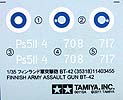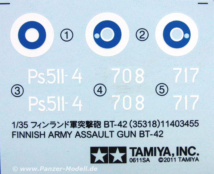 Die Bauanleitung enthält 27 Bauschritte, die mit guten und sehr verständlichen Zeichnungen und textlichen Hinweisen den Bau des Modells begleiten, so wie man es von Tamiya kennt und liebt. Zusätzlich gibt es ein 4seitiges A4 Faltblatt das mehrsprachig über die Geschichte des BT 42 berichtet, sowie ein doppelseitig farbig gedrucktes A4 Blatt mit Originalfotos eines BT 42 aus dem Museum in Parola und ein A4 Blatt mit 3 Bemalungsvorlagen. Fairerweise muss man sagen - für deutschland gibt es 3 Bemalungs und eine Markierungsvariante. Leider haben finnische Fahrzeuge die dumme Angewohnheit Kreuze als markierungen zu haben die hierzulande nicht erlaubt sind. Tamiya Deutschland war also in diesem Fall angehalten hier Abhilfe zu schaffen und so sind diese besagten Markierungen unkenntlich gemacht, bzw. die Teile vom Decalbogen gänzlich entfernt. So verbleibt die markierungsvariante für: