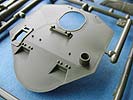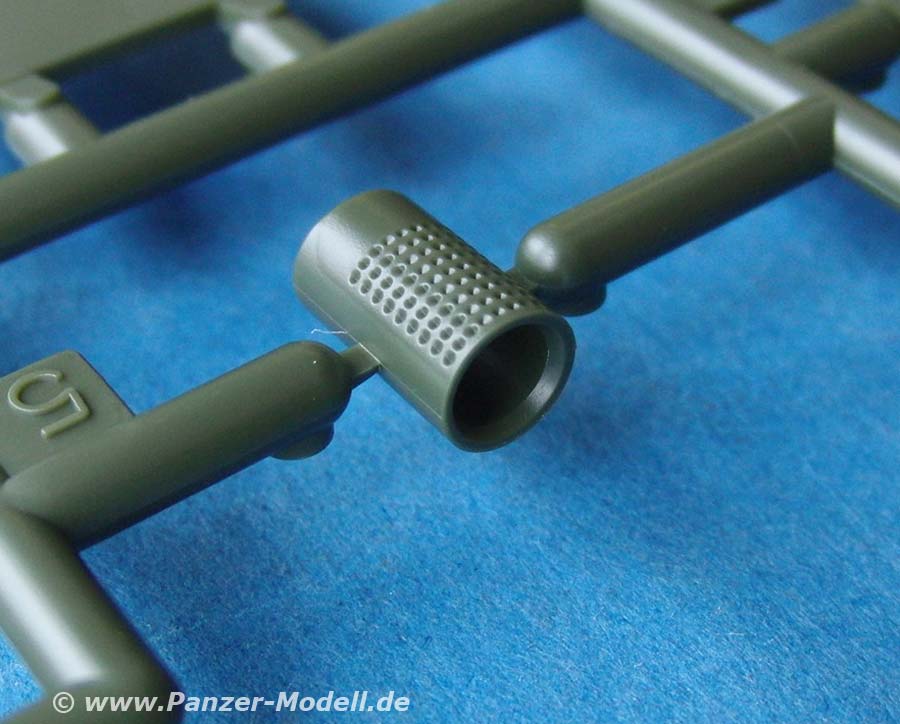 Der Turm ist komplett neu und setzt sich aus mehreren Teilen zusammen - diese machen ebenfalls einen sehr guten Eindruck. Die wuchtige Kanone ist leider als Halbteil ausgeführt, weist aber dafür eine recht schöne einteilige Mündzngsbremse mit Bohrungen auf - diese sind zwar nicht durchgeführt, lässt sich aber sicher recht einfach vom geübten Modellbauer nacharbeiten. Die Kanone bleibt beim Einbau in den Turm höhenrichtbar. Der Turm weist rudimentäre Inneinrichtung auf und die Luken lassen sich auch offen darstellen.