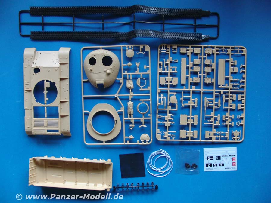 Im Karton finden wir 6 Spritzlinge, Oberwanne, Unterwanne, Vinylketten, Gittermaterial, Polycaps und ein Decalbogen.