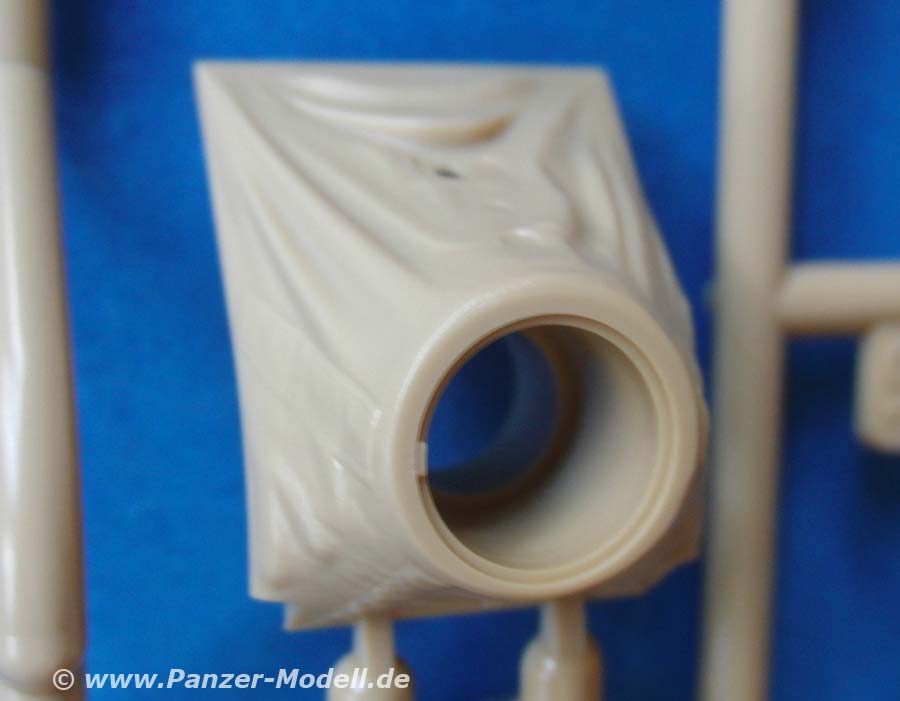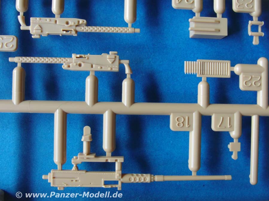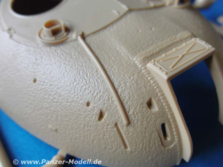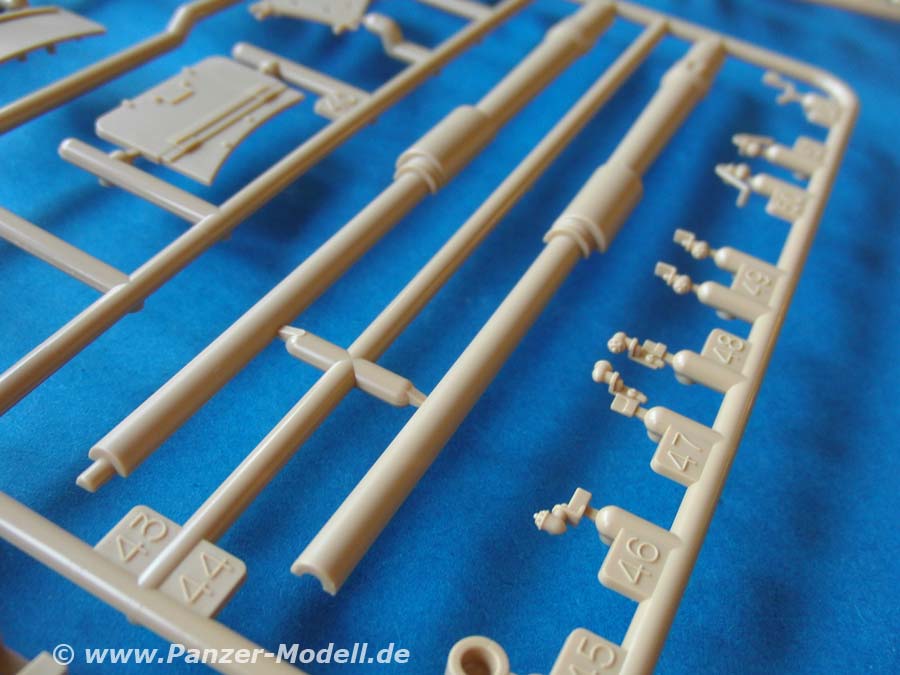 Der Turm ist wurderschön mit rauer Gussstruktur dargestellt und mit der neuen 105mm Kanone, die den Tiran 5Sh ausmacht. Dieses Rohr wird aus zwei Halbteilen zusammengesetzt mit einer separaten einteiligen Mündung. Die weiteren Anbauteile sind fein und sauber dargestellt. Die Merkmale für den Tiran, wie etwa die Kanisterhalterungen am Turmheck, der Scheinwerfer und Antennenbefestigungen sind ebenso enthalten. Sogar das mittig auf dem Turmdach montierte M1919 Browning, das für die späten Tiran 5 typisch war, ist enthalten.