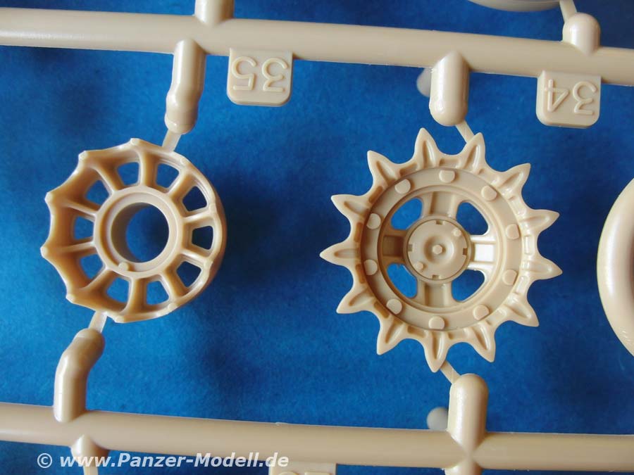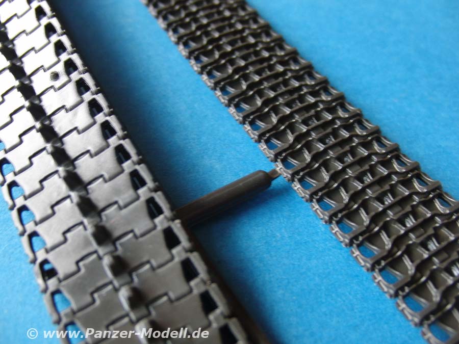 Die Qualität der Teile ist wie von Tamiya gewohnt sehr gut und vor allem sehr sauber. Die Laufrollen und Treib/Leitrad bleiben dank Polycaps beweglich und die Schwingarme werden einzeln in die Wanne eingesteckt. Die Ketten sind einteilige Vinylketten, die von der Qualität her gut und recht schön detailliert sind. Und es finden sich hier keine fiesen Auswerfermarken, weder auf der Innen- noch der Aussenseite. Lediglich die verpackung im Karton führt oft dazu dass diese Ketten in der Mitte geknickt oder verdreht sind - diese Torsionen muss man erstmal wieder rauskriegen.