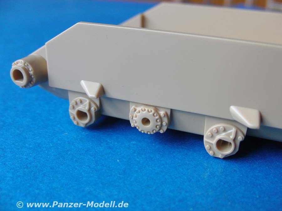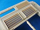 Die Oberwanne stellt die korrekten Details für die IDF Version mit geänderten Kettenblenden und der großen Staukiste am Heck dar. Die Motorlüftergitter werden mit dem beiliegenden Gittermaterial dargestellt, das nach Vorlage in der Bauanleitung ausgeschnitten werden muss.