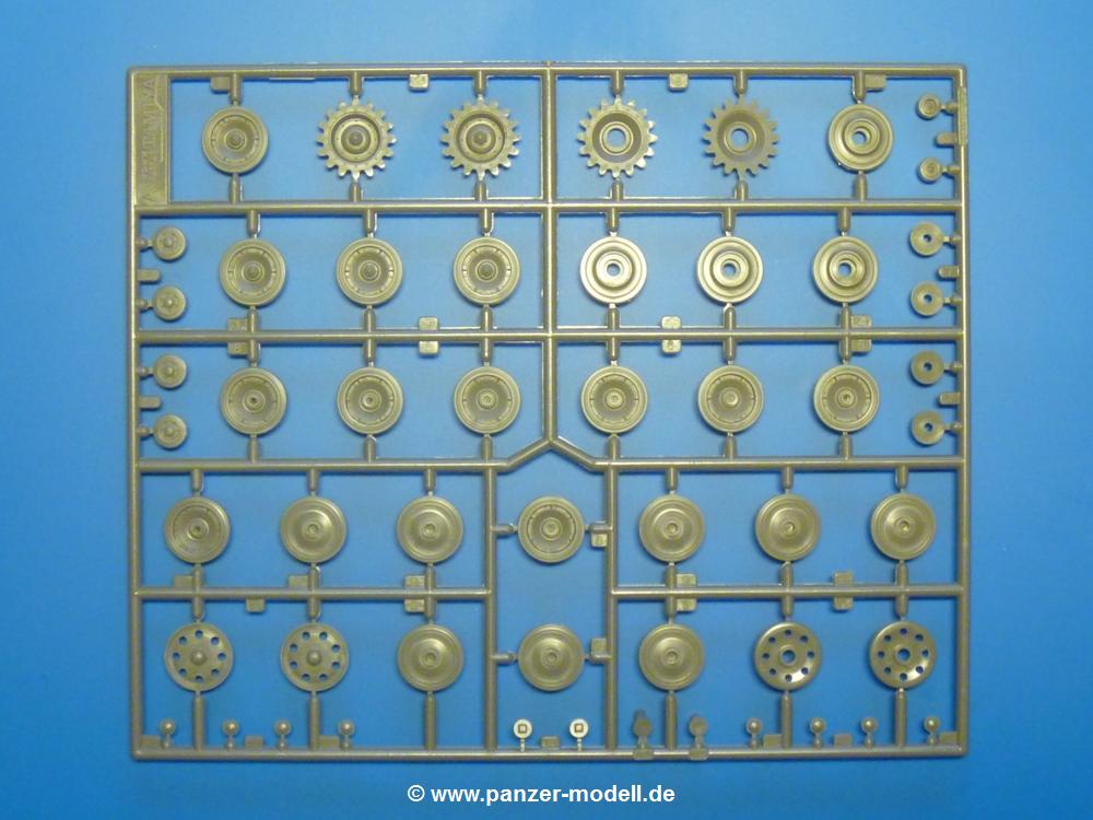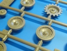 Im ersten Schritt werden Antriebs-, Leit-, Laufräder und Federn zusammengesetzt. Dabei ist vorgesehen, dass die Räder drehbar bleiben. Bei den Laufrollen sind die Verschraubungen und Verstärkungsrippen sehr schön dargestellt, auch wenn die sehr feinen Sicherungsdrähte der Schrauben fehlen. Der Grat auf der Lauffläche eines jeden Rades stört ein wenig, sollte aber kein Problem darstellen. Es gibt 2 verschiedenen Sorten Laufrollen. Zum einen pro Seite 2 Laufrollenpaare, die als erstes und letztes Laufrad auf einen eigenen Schwingarm kommen werden. Zum anderen 4 Laufrollenpaare, die zu je 2 Laufrollenwagen pro Seite mittels eines Verbindungswinkels zusammengefasst werden. Hier kommen dann auch die separaten Laufrollennaben zum Einsatz. Die Antriebsräder bestehen nur aus dem inneren und äußeren Zahnkranz. Auf den ersten Blick erscheinen einem die Nieten an den Antriebszahnkränzen etwas flach, aber das Original zeigt, dass Tamiya richtig liegt. Eine Gummibuchse im Inneren wird die Drehbarkeit sichern. Auch die mit 8 runden Löchern durchbrochenen Leiträder werden sich drehen können, nur wird dies hier durch einen Plastikbolzen erreicht, der in das innere Leitrad eingesetzt wird. Jede Spiralfeder besteht aus 2 Teilen, dem Federkörper mit einem Flansch und der zweite Flansch separat. Die Darstellung der Feder ist durchaus akzeptabel.