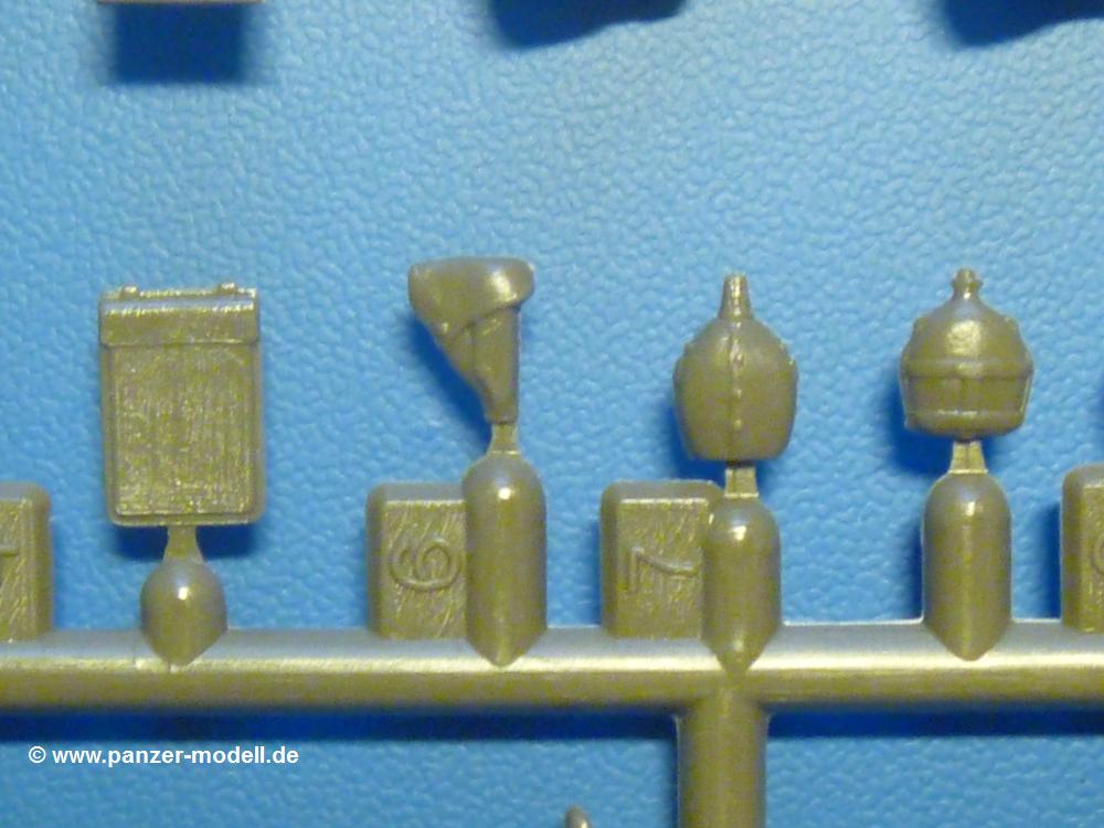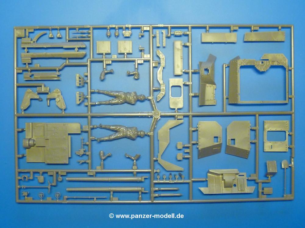 Der Inhalt, verpackt in verschiedene Klarsichtbeutel, besteht aus 3 olivgrünen Spritzlingen, 2 Vinylketten und 2 Spritzlingen mit Vinylbuchsen, sowie Ober- und Unterwanne für das eigentliche Fahrzeug. Dazu kommen 2 ebenfalls olivgrüne Spritzlinge für die zusätzlich enthaltene Figuren und deren Ausrüstung.