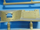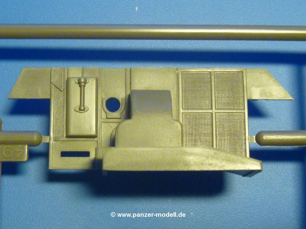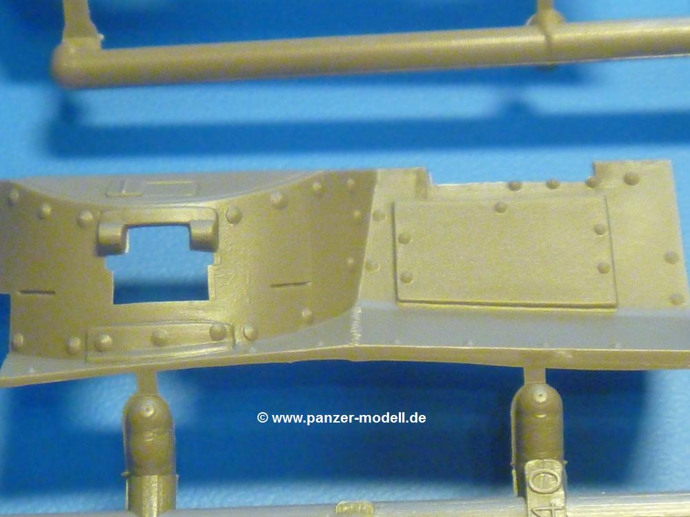 Im nächsten Schritt wir die Fahrerfront mit dem Fahrererker aufgeklebt. Die Fahrersichtklappe kann geöffnet oder geschlossen angebaut werden. Statt eines Bug-MGs in Kugelblende gibt es nur eine aufgenietete Platte. Das MG ist im Bausatz enthalten, wird aber nicht benötigt. Die Stütztraverse für die Kanonenlafette wird in die Kampfraumpanzerung eingeklebt, dann setzt man die Panzerung auf die Wanne. Ein Aufbewahrungskasten (für die Optik?) wird aufgeklebt. Die Heckklappe über dem Kühler wird nur eingesteckt, aber nicht geklebt. So kann man diese wieder öffnen, um den Kühler zu zeigen. Kleines Manko an der Heckklappe - winzige Fischhäute zwischen den Rippen stören das Bild und sollten entfernt werden. Hinter die Heckklappe kommt noch ein rechteckiger Wartungsdeckel und auf die Kettenabdeckungen die Schutzbleche der Auspuffaustritte aus der Wanne.