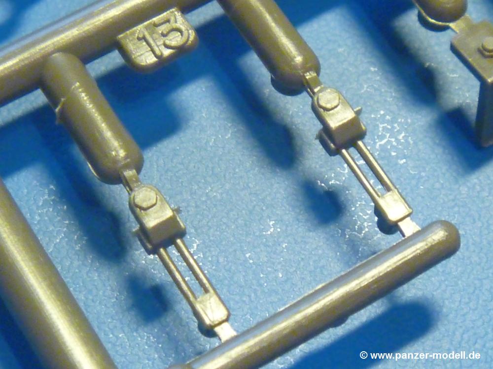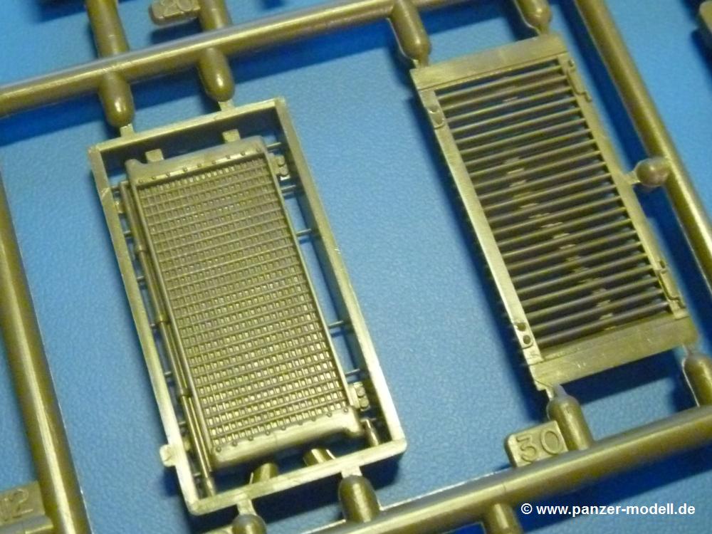 Trotz des Alters der Formen findet man keinen Formversatz und der Grat hält sich außer bei den Laufrollen in Grenzen, ist aber leicht zu entfernen. Einzig beim Kühlergrill findet man Überschussmaterial, das sich wie eine Schlange zwischen den Rippen windet, aber auch dies sollte man mit einem scharfen Bastelmesser leicht beseitigen können. Auswerferspuren auf größeren Teilen sind vorhanden, oft aber so platziert, dass man sie später nicht mehr sieht. Nur bei den Innenseiten der Kasematte fällt etwas Spachtel- und Schleifarbeit an, da diese gut einsehbar sein werden.