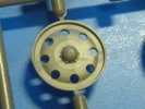 Nun können die im ersten Schritt erstellten Räder an ihre Plätze an der Wanne. (Meine Empfehlung: Die Antriebszahnräder jetzt noch nicht aufstecken, sondern erst im Schritt 4 bei Montage der Kette!) Dazu kommen die Stützrollen, die pro Seite aus 2 Paaren mit größeren Rädern und einem einzelnen, kleineren Rad bestehen. Die Außenräder der größeren Stützrollen sind mit je 6 Löchern versehen wie beim Original, gehen aber nicht komplett durch. Dies kann man mit einem Punktwashing in schwarz kaschieren oder mit einem Bohrer die Löcher ganz durchbohren. Die Stützrollen werden geklebt und sind nicht drehbar. Die abgerundete Heckplatte mit feinen Nieten und Schrauben verschließt die Unterwanne nach hinten. Mittig bereits angegossen befindet sich die Heckleuchte mit den 3 Signallampen (Kolonnenlichter?). Auch finden wir hier die fein detaillierten Spannschrauben des Kettenspanners. An der Heckplatte werden anders als vorn 2 Augen mit Schäkel angebracht. Beim rechten Schäkel finden Nummernschild und Bremsleuchte ihren Platz. Auf die obere Hälfte wird ein Staukasten mit Scharnierdeckel aufgesetzt. Daran wird das mehrfach gewickelte Drahtseil mit 2 Halterungen angebracht. Obwohl das Seil aus nur einem Teil besteht, ist es sehr schön anzusehen und muss sich nicht verstecken. Nun wird nur noch der Wannenboden mit dem Fahrersitz und 2 Holzkisten versehen und dann in die Wanne eingesetzt. Die im Wannenboden befindlichen Klappen mit angegossenen Griffen und Scharnieren sind schöne Details, die durch die offene Kasematte eingesehen werden können. Instrumente und Bedienelemente für den Fahrer gibt es nicht, wären aber auch nach Einbau der Kanone und Kasematte sowieso nicht mehr zu sehen.