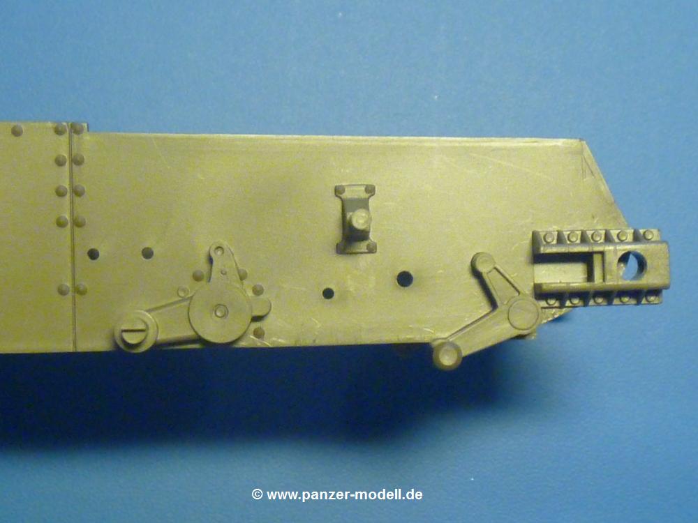 Die zusammengebauten Auspuffe kommen auf ihre Plätze auf den hinteren Kettenabdeckungen. Die kleine Wartungsklappe hinter dem Kühler erhält einen Knebelgriff. Links und rechts der Klappe klebt man 2 feine Haltegriffe auf die Panzerung. Der Wagenheber erhält noch seinen Standfuß, dann platziert man ihn auf der rechten Kettenabdeckung. Etwas noch vorn versetzt klebt man die Brechstange. Die rechte Kampfraumseite bekommt noch eine genietete Panzerplatte. Dann wird die Kanonenlafette in die Traverse im Kampfraum eingesetzt (nicht geklebt) und bleibt dadurch seitenrichtbar. Auch die beiden vorderen Wartungsklappen bekommen noch je einen Knebelgriff.