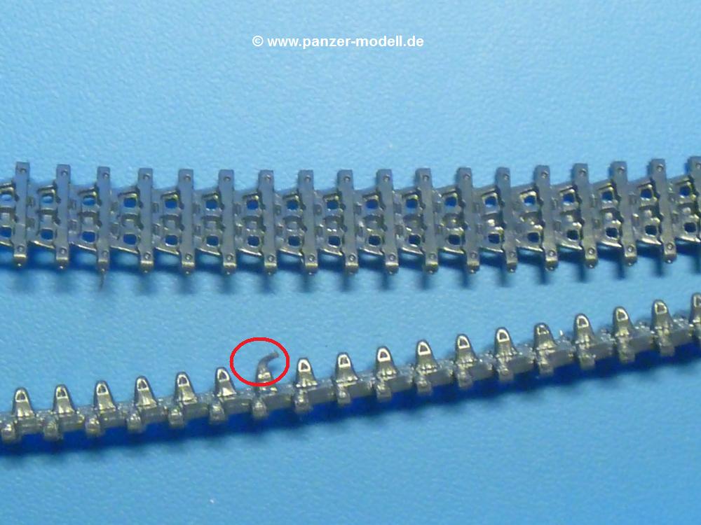 Schritt 4 behandelt nur 5 Teile. Zum einen den Kühler in seinem Rahmen und angedeuteten Leitungen. Die Gitterstruktur kommt deutlich zu Geltung. Der Kühler wird von innen in die Oberwanne eingeklebt. Nun wird die Rückwand zum Motorraum eingesetzt. In der Rückwand sind fein strukturierte Lüftergitter vorhanden. Schade, dass man später nicht mehr viel davon sehen wird. Bevor man Ober- auf Unterwanne setzt, montiert man die Ketten. Kaum zu glauben, dass diese aus über 30 Jahre alten Formen stammen sollen, denn die Detaillierung ist wunderbar wie z.B. die angedeutet gelochten Führungszähne. Hier und da gibt es kleine Angüsse z.B. an den Zähnen, die man leicht entfernen kann. Jede Kette besteht aus einem Vinylstrang, der an den Enden mittels Zapfen verbunden wird. Laut separatem Anleitungsblatt kann man die Kette mit Plastikkleber kleben oder man "pilzt" gemäß der älteren Anleitung die Zapfen mit einem heißen Schraubenzieher an den Enden auf, so dass sich die Kette nicht mehr öffnen kann. Hatte man die Antriebszahnräder noch nicht aufgesteckt, ist das Aufziehen der Kette ein Kinderspiel. Dann setzt man nur noch die Antriebsräder in die Kette ein und drückt sie auf ihre Achsen. Nun kann die Oberwanne aufgesetzt werden. Wieder fallen die schönen Nieten, Scharniere und Griffe auf. Die Entlüftung sitzt beim Ho-Ni in der Kettenabdeckung. Hier findet man nur die Öffnung, aber kein Gitter. Bei aufgezogener Kette nur zu sehen, wenn man es weiß und schräg von unten hineinschaut. Daher sehe ich dies nicht als Manko an.
