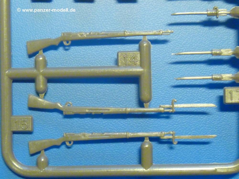 Kommen wir noch zu dem zusätzlichen Figurensatz, dem alten Bekannten, bestehend aus 1 Offizier und 3 Soldaten in Kampfposen und der entsprechenden Bewaffnung/Ausrüstung. Der Faltenwurf ist nicht ganz so schön ausgeprägt wie bei heutigen Figuren, aber immer noch im oberen, akzeptablen Bereich. An den Teilen findet man etwas mehr Grat als beim Ho-Ni, wie man auf den Übersichtsfotos bereits sehen kann.