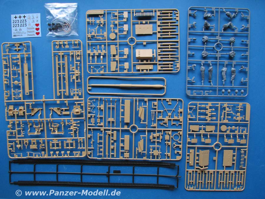 Im Karton finden sich 10 Spritzlinge, Unterwanne, Vinylketten, Polycaps, Drahtmaterial, Seilmaterial und Decals.
