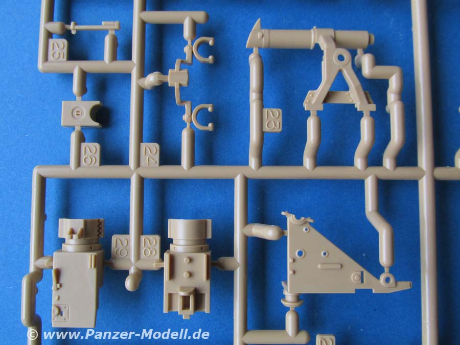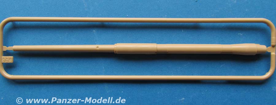 Die Kanone setzt sich aus relativ vielen Teilen zusammen und macht insgesamt einen guten Eindruck. Das Rohr ist aus Plastik und in einem Stück gemacht auf das vorn eine dreiteilige Mündungsbremse geklebt wird. Wer übrigens beim Blick in den Karton von der falschen Seite schaut, wird ggf. länger suchen, bis er das Rohr, das an einer Längsseite des Kartons angeklebt ist. ;-)