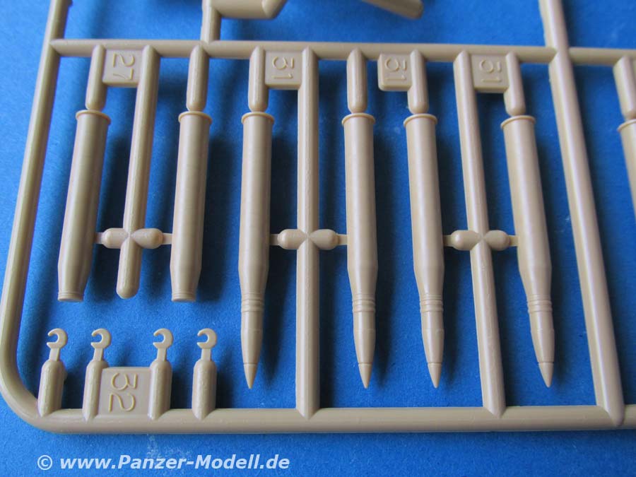Für die Munitionsschränke im Kampfraum liegen dem Bausatz auch entsprechende Granaten aus Plastik bei. Diese sowohl als AP und HE Granaten wie auch leere Hülsen. Der Bau der Munitionsschränke ist bei offenen Darstellung mit etwas Eigenarbeit verbunden, die aber genau in der Bauanleitung angegeben wird.
