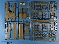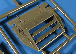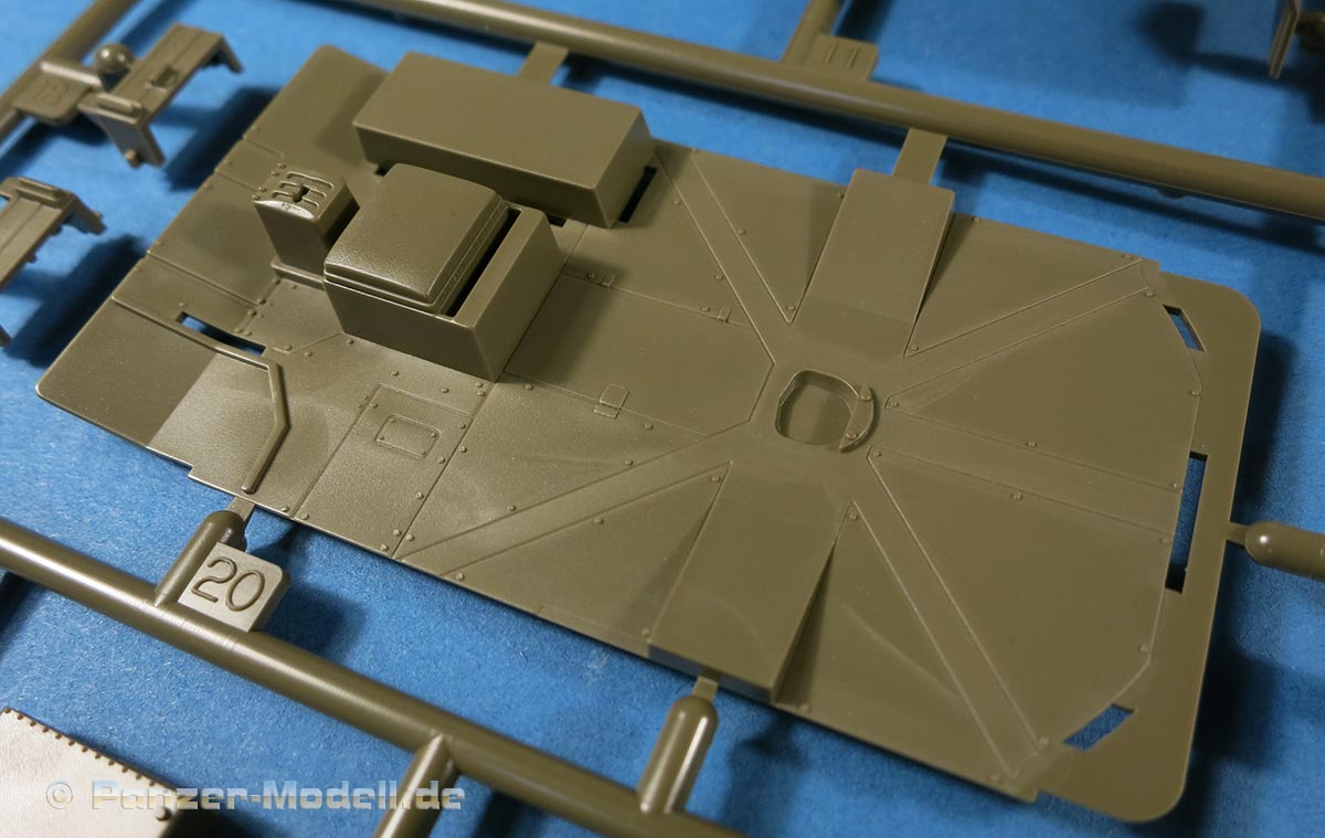 Auch der offene Aufbau ist mehrteilig ausgeführt. Der Innenraum, der von oben eingesehen werden kann, ist natürlich im Bausatz enthalten und umfasst natürlich Bodenplatte, Sockel, Lafette, Munitionshalterungen, Zubehör, Staukisten und ... ja, den Fahrerplatz, der ungewöhmlicherweise bei diesem Fahrzeug "hinten" im Fahrzeug ist, wobei genauergesagt bei diesem Fahrzeug die Kanone nach hinten zeigt und somit der Fahrer natürlich vorn sitzt.