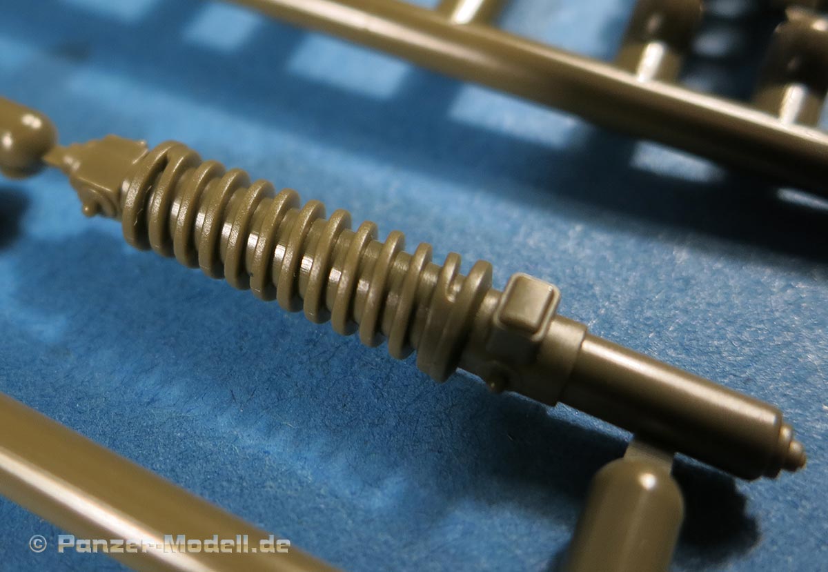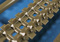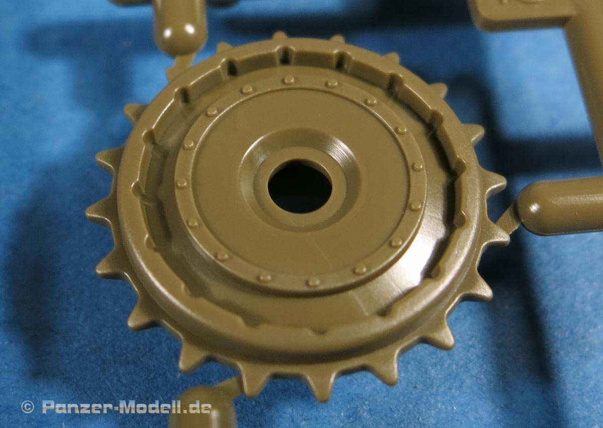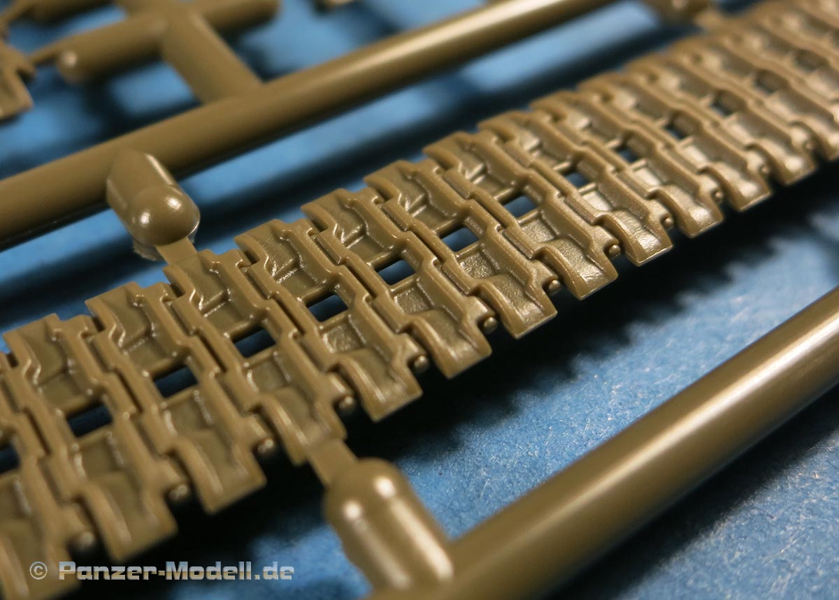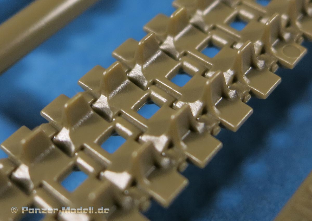 Die Darstellung der Ketten in Einzelglieder (für die Umläufe um Treib- und Leitrad) und Kettensträngen ist ganz schön mit feinen und scharfen Details auf der Innen- und Aussenseite und keien Auswerferstellen. Der Zusammenbau sollte auch von Anfängern problemlos zu bewältigen sein.