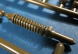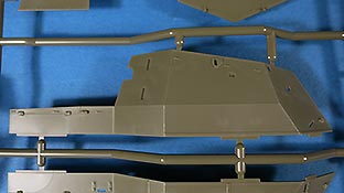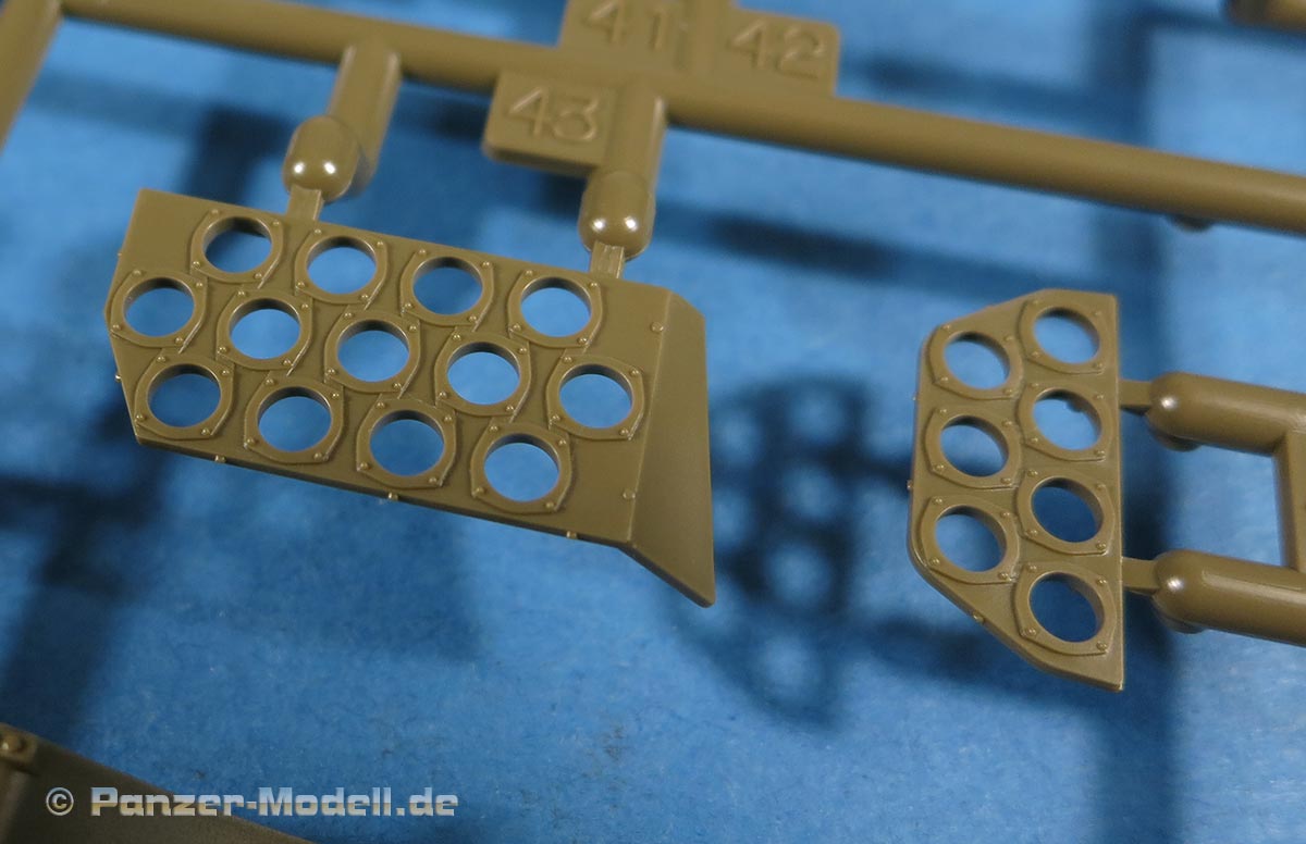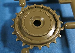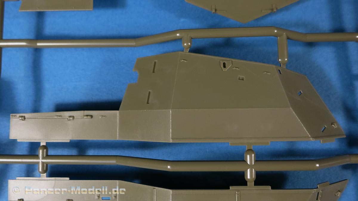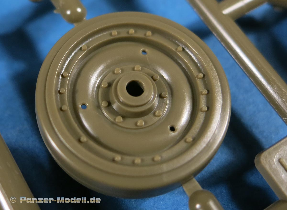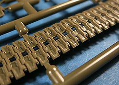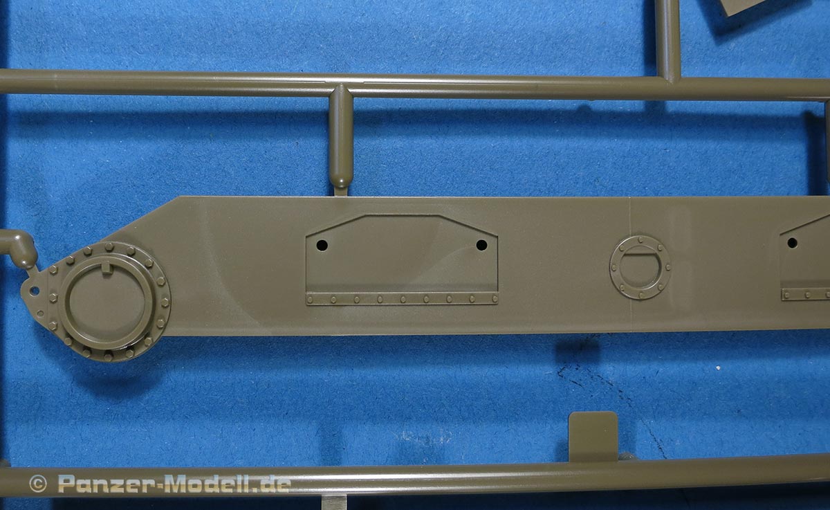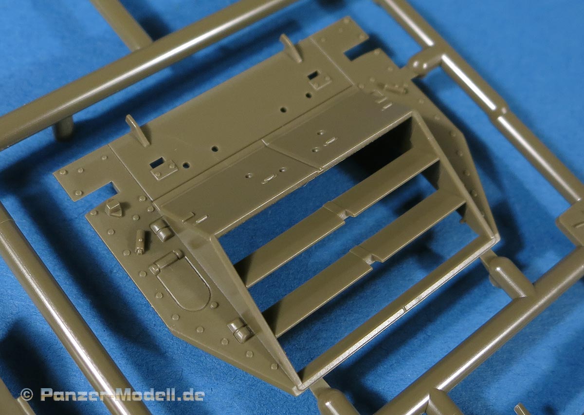 Die Darstellung der Ketten in Einzelglieder (für die Umläufe um Treib- und Leitrad) und Kettensträngen ist ganz schön mit feinen und scharfen Details auf der Innen- und Aussenseite und keien Auswerferstellen. Der Zusammenbau sollte auch von Anfängern problemlos zu bewältigen sein.