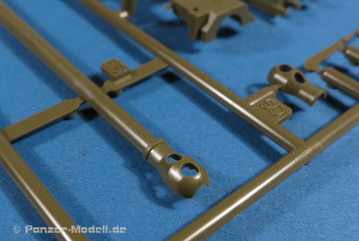 Die Kanone ist vollständig mit Lafette und "Innenleben" dargestellt und das mit guten Details und einer überschaubaren Anzahl an Bauteilen. Das Rohr ist aus Plastik, einteilig und nur die Mündungsbremse mit einem separaten Halbteil versehen - die Versäuberungsarbeiten sollten sich im Rahmen halten.