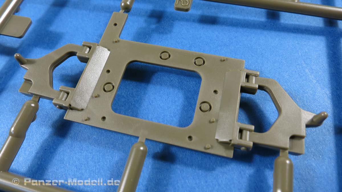 Die Unterwanne ist einteilig und einwandfrei gespritzt. Das Fahrwerk ist sehr schön gemacht und für Tamyia fast schon erstaunlich vielteilig. Das bringt allerdings ein solches Fahrwerk von vierschsigen Gefechtsfahrzeugen so mit sich mit all den Halterungen, Ansätzen, Achsen, Federn, Lagerelementen, Antriebssträngen, Schutzplatten, usw.