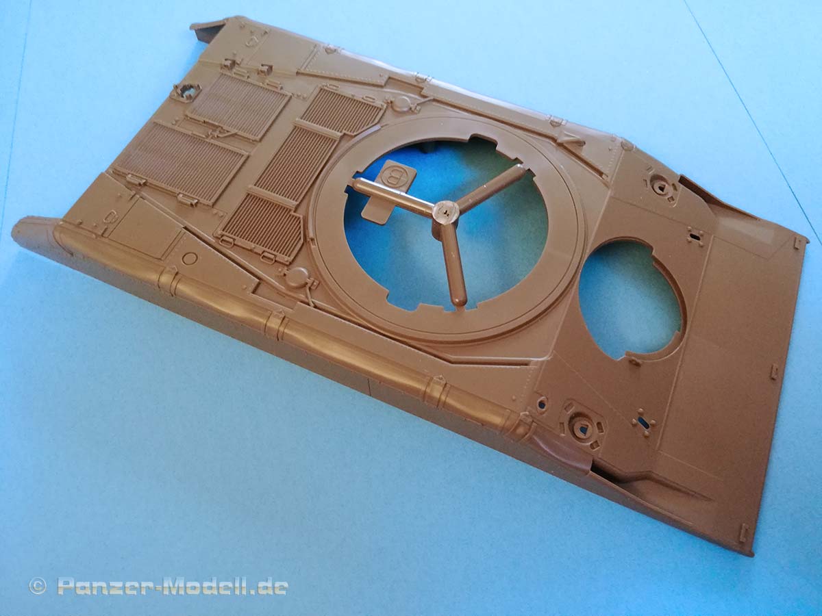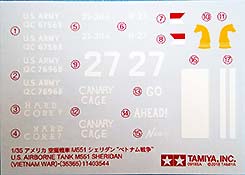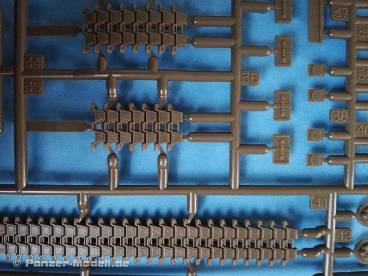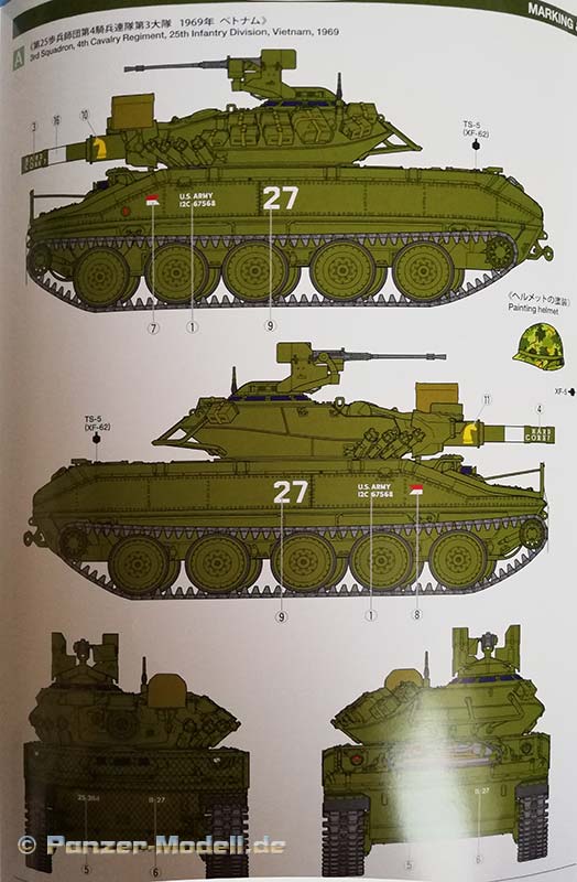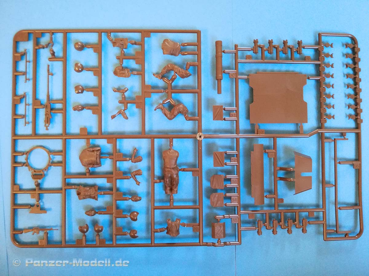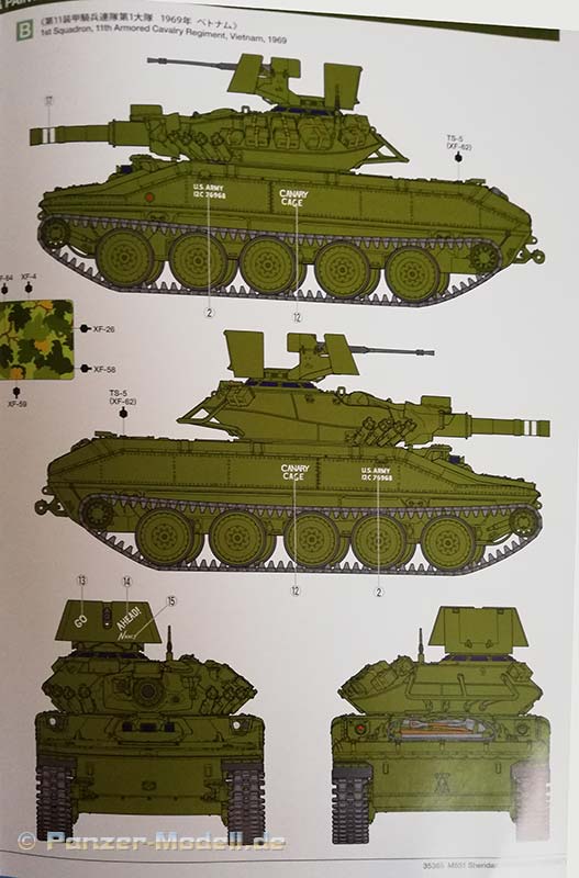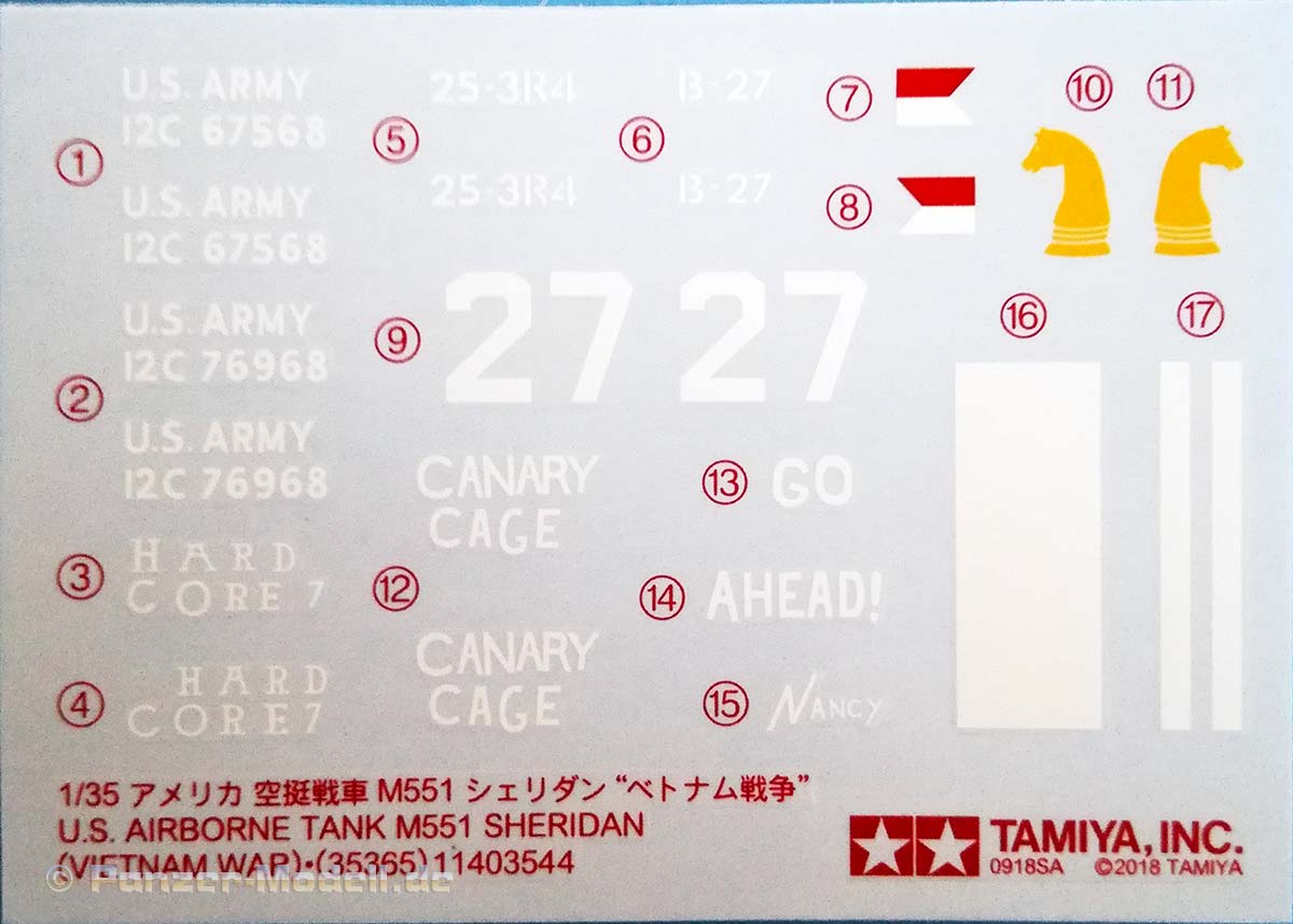Der Sheridan hatte mehrere entscheidende Vorteile: Er blieb nicht so oft im Schlamm stecken wie der 52 Tonnen schwere M48 Patton, und er warf auch nicht so oft die Kette. Dies machte den kleinen Panzer bei seinen Besatzungen sehr beliebt. Das geringe Gewicht und die hohe Mobilität erwiesen sich als wertvoll, und die Waffe erwies sich als effektive Antipersonenwaffe, wenn sie mit der M657 HE-Munition oder der M625-Kanistermunition verwendet wurde. Die Armee begann ab 1978 den Sheridan auszumustern, obwohl es damals keinen wirklichen Ersatz gab. Die 82d Airborne Division konnte sie jedoch bis 1996 behalten. Lange Jahre gab es in 1:35 aus Plastik nur das Tamiya Modell von 1971 (mit allen Wiederauflagen) inklusiver seiner Klone von Academy. 2005 brachte Academy eine neue Bausatzform heraus, diese konnte jedoch nicht vollständig überzeugen es gab dort grundlegende Probleme in der Maßhaltigkeit, als Beispiel sei hier nur einmal die völlig überdimensionierte Hauptwaffe genannt. Nun hat Tamiya einen völlig neuen Bausatz entwickelt und auf den Markt gebracht, der schon auf den ersten Blick einen hervorragenden Eindruck macht. Typisch für diesen Hersteller zeigen sich die Bauteile sehr fein detailliert an vier olivgrünen und einem klaren Gussrahmen. Zusätzlich ist Gittermaterial, Draht, etwas Vinylschlauch, Decals, eine Bauanleitung und ein Faltblatt mit den historischen Hintergründen des Fahrzeuges vorhanden. An den Gussrahmen ist weder Fischhaut vorhanden noch finden sich die Auswerfermarken an später noch einsehbaren Stellen. Die Wanne besteht nicht aus einem einzelnen Bauteil, sondern wird aus mehreren Bauteilen zusammengesetzt. Dies sollte aber bei der sprichwörtlichen Tamiya- Passgenauigkeit kein Problem darstellen. Bereits in der ersten Baustufe müssen Löcher gebohrt werden (für die Zusatzpanzerung unter dem Bug) dies und das allgemeine Layout der Gussrahmen deutet noch auf Kommende Versionen des Panzers hin. Die Ketten bestehen aus Einzelkettengliedern und Kettensegmenten, was einerseits einen leichten Zusammenbau verspricht und andererseits schön realistisch aussieht. Die Segmente sind sogar in den korrekten Durchhang gespritzt hervorragend! Für den Fahrerplatz ist eine Wanne vorhanden, welche in die eigentliche Unterwanne geklebt wird diese kann später eine Fahrerfigur auf einer Polycap aufnehmen. Warum auf einer Polycap? Damit man je nach Lust und Laune die Fahrerfigur wieder rausnehmen kann und die Fahrerluke geschlossen darstellen kann. Aus diesem Grunde wird auch die Kuppel des Fahrerplatzes mit Polycaps befestigt zur leichteren Abnehmbarkeit sehr innovativ. Als optionale Bauteile kann ein improvisierter RPG Zaun, ein ACAV Schild und ein verpackter oder ein unverpackter Zielscheinwerfer verbaut werden. Dem Bausatz liegen sehr gute Figuren bei, zwei Vollfiguren für Kommandant und Ladeschütze und eine Halbfigur für den Fahrer. Bei der Figur des Ladeschützen, welcher sichernd mit einem M16 auf dem Fahrzeug dargestellt ist, kann man zwischen einem Besatzungshelm oder einem Gefechtshelm wählen. Der Kommandant hat das .50 MG fest im Griff. Die Bauanleitung führt in 38 klaren Schritten zum Ziel und ist nicht überfrachtet. Als Markierungsvarianten empfiehlt Tamiya zwei Fahrzeuge aus dem Vietnamkrieg (beide in Olive Drab): 1. 3rd Squadron, 4th Cavalry Regiment, 25th Infantry Division, Vietnam 1969 „Hard Core 7“ Mein Fazit: Absolute Kaufempfehlung ein schöner Bausatz mit drei perfekt abgestimmten hochklassigen Figuren. Trotz der übersichtlichen Anzahl an Bauteilen verspricht das Fahrzeug einen tollen Realismus und einen zügigen Bau - Exzellent.