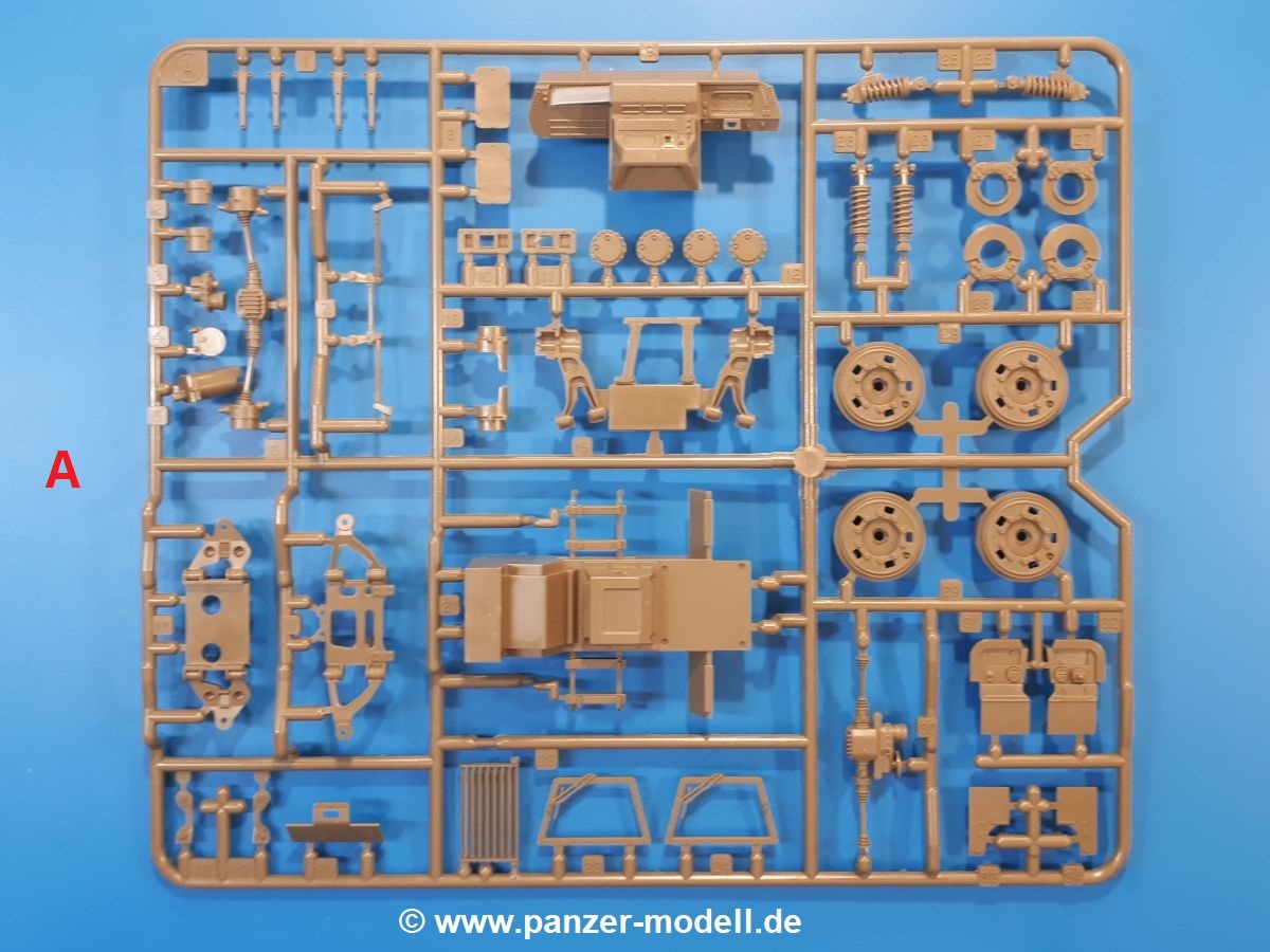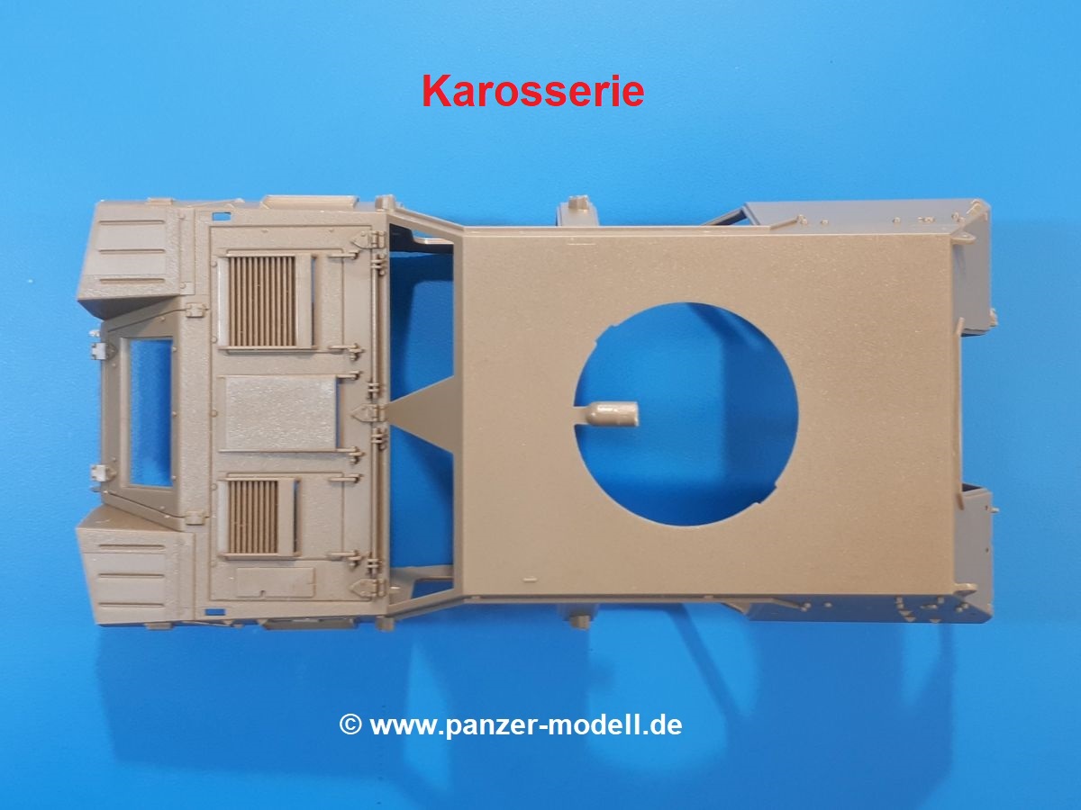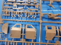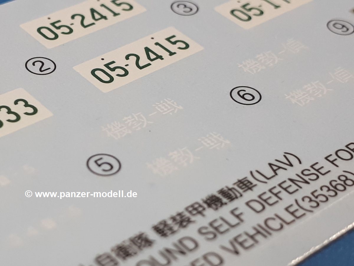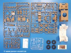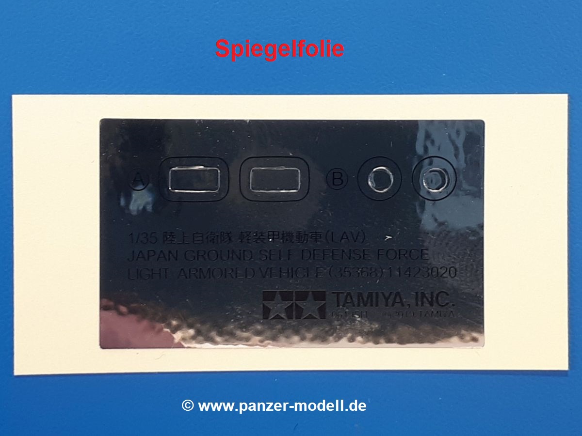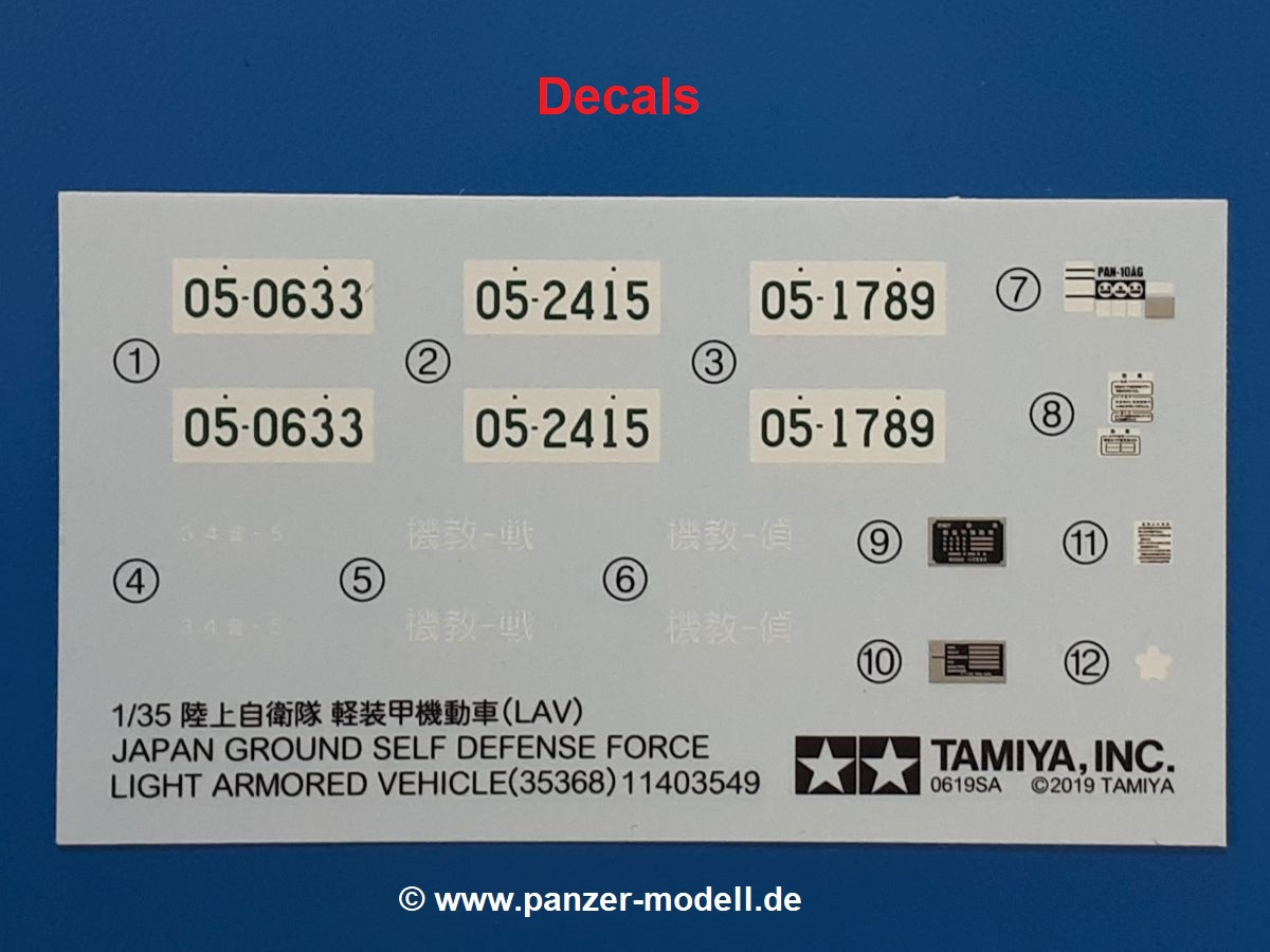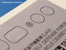 Der Bausatz: Tamiya brachte das LAV (Light Armored Vehicle) bereits 2004 in der Iraq-Version auf den Markt, 2006 mit zusätzlichen Figuren. Die Wiederauflage stellt die Version dar wie sie in Japan genutzt wird. Der Inhalt des 300 x 220 x 55 mm Kartons mit Stülpdeckel besteht aus 3 oliv-grünen Spritzlingen, Karosserie, Unterboden aus Aluminium, Klarsichtspritzling, Spiegelfolie, 4 Gummireifen, 4 Kunststoffmuffen, verschiedenen Schrauben, der Tamiya-typischen 10-seitigen Bauanleitung im Faltblatt-Format und einem 6-seitigen Faltblatt mit Informationen zum Fahrzeug, der Bemalung und Decalvarianten. Tamiya ist bekannt für seine Qualität und schafft es immer wieder, mehrere Teile aus einem Stück herzustellen, ohne an Details einzubüßen. So kommt der Bausatz mit weniger Einzelteilen aus als der vergleichbaren Konkurrenten. Alles ist sauber gespritzt, ohne Sinkstellen, Versatz oder Fischhäute. Einige wenige Auswerferspuren sind zwar zu finden, bereiten aber keine Probleme. Eine Besonderheit des Bausatzes ist der Unterboden aus Aluminium, der dem Modell ordentlich Gewicht verleiht. Baugruppen wie die Mittelkonsole und die Achsen werden mit dem Unterboden verschraubt. Die Schrauben verschwinden dann aber unter Wartungsdeckeln aus Plastik. Andere Teile werden dann mit Sekundenkleber angebracht, da normaler Plastikkleber die unterschiedlichen Materialien nicht zusammenhält. Die beiden Achsen ob ihrer Komplexität mit Einzelradaufhängung, Differential, Kühlrippen, Scheibenbremsen inkl. Bremssattel bestehen trotzdem nur aus wenigen Teilen. Besondere Hingucker die Federbeine. Plastikmuffen in den Radlagern sorgen dafür, dass die Raeder einfach aufgesteckt werden können. In die Felgen aus Plastik wird ein Metallstift eingesteckt, der nicht so leicht bricht wie Plastik und für die Drehbarkeit der Raeder sorgt. Die Reifen aus weichem, schwarzem Gummi sehen mit den Flankenaufdrucken und dem Profil nicht nur echt aus, sie riechen auch so! Der Innenraum ist gut ausgestattet mit Mittelkonsole, Gepäckgestell und Feuerlöscher. Die Rücksitze sind wie im Original etwas spartanisch, dafür sind Fahrer- und Beifahrersitz gut gepolstert, was auch entsprechend gut wiedergegeben ist. Wenn man das Fahrzeug mit Fahrer bauen möchte, setzt man Rumpf, Kopf, Helm und linken Arm zusammen und platziert den Fahrer auf seinem Sitz. Die große Armaturentafel weist bereits viele Schalter und Instrumente auf. Es werden nur noch Wahl-, Blinkerhebel und Lenkrad angebracht. Dann wird die Tafel in die Karosserie eingebaut. Nach Einbau der Scheinwerfer aus Klarsichtmaterial und Anbau der hinteren Schmutzfänger wird die Karosserie mit Sekundenkleber auf das Unterteil geklebt. Danach kann auch der rechte Arm des Fahrers angebracht werden. Der Kühlergrill mit durchbrochenen Lamellen macht ein guten Eindruck. Die Rahmen der Frontscheiben haben bereits angegossene Scheibenwischer. Man kann sie vor Anbringung der Scheiben bemalen. Sämtliche Türen haben sowohl Außen- als auch Innendetails und können geöffnet oder geschlossen gebaut werden. Leider finden sich grad auf den Innenverkleidungen einige Auswerferspuren, die sich aber leicht verspachteln lassen. Der Drehring der Dachluke kann drehbar eingebaut werden. Wie bei den Türen haben die Lukendeckel Außen- und Innendetails für die offene oder geschlossene Bauweise. Je nach zu bauendem Modell kann man zwischen Anbringung der Nebelmittelwurfanlage mit rechtseitigem Antennensockel und Dachreling samt leichtem MG und rückseitigem Antennensockel wählen. Das einzige Außenbordwerkzeug ist eine Schaufel, aber es gibt noch Handgriffe, Anhängerkupplung, Ösen und Außenspiegel anzubauen. Für die Außenspiegel liegt selbstklebende Spiegelfolie dem Bausatz bei. Der Decalbogen enthält neben Feuerlöscherbeschriftung und Typschildern für den Innenraum Decals für 3 Fahrzeuge der japanischen Selbstverteidigungsstreitkräfte :