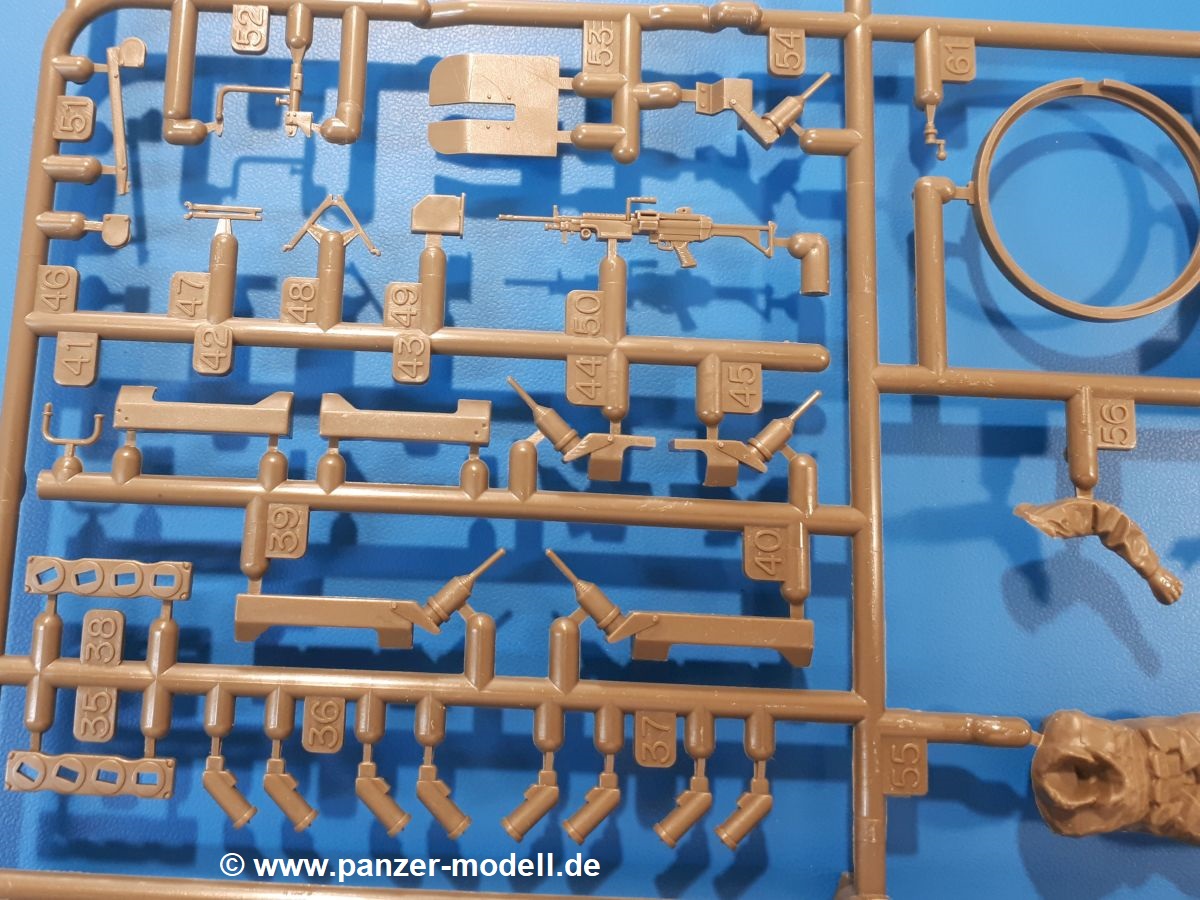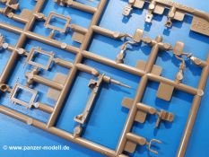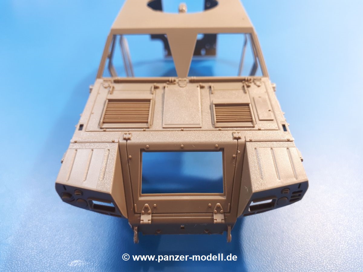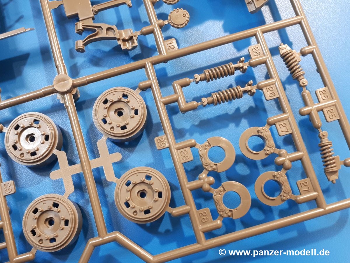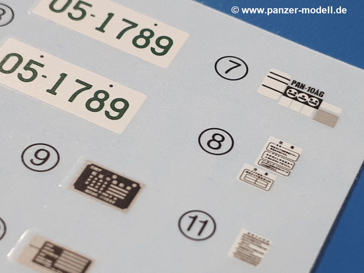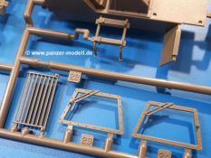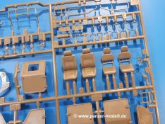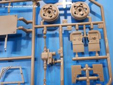 Der Bausatz: Tamiya brachte das LAV (Light Armored Vehicle) bereits 2004 in der Iraq-Version auf den Markt, 2006 mit zusätzlichen Figuren. Die Wiederauflage stellt die Version dar wie sie in Japan genutzt wird. Der Inhalt des 300 x 220 x 55 mm Kartons mit Stülpdeckel besteht aus 3 oliv-grünen Spritzlingen, Karosserie, Unterboden aus Aluminium, Klarsichtspritzling, Spiegelfolie, 4 Gummireifen, 4 Kunststoffmuffen, verschiedenen Schrauben, der Tamiya-typischen 10-seitigen Bauanleitung im Faltblatt-Format und einem 6-seitigen Faltblatt mit Informationen zum Fahrzeug, der Bemalung und Decalvarianten. Tamiya ist bekannt für seine Qualität und schafft es immer wieder, mehrere Teile aus einem Stück herzustellen, ohne an Details einzubüßen. So kommt der Bausatz mit weniger Einzelteilen aus als der vergleichbaren Konkurrenten. Alles ist sauber gespritzt, ohne Sinkstellen, Versatz oder Fischhäute. Einige wenige Auswerferspuren sind zwar zu finden, bereiten aber keine Probleme. Eine Besonderheit des Bausatzes ist der Unterboden aus Aluminium, der dem Modell ordentlich Gewicht verleiht. Baugruppen wie die Mittelkonsole und die Achsen werden mit dem Unterboden verschraubt. Die Schrauben verschwinden dann aber unter Wartungsdeckeln aus Plastik. Andere Teile werden dann mit Sekundenkleber angebracht, da normaler Plastikkleber die unterschiedlichen Materialien nicht zusammenhält. Die beiden Achsen ob ihrer Komplexität mit Einzelradaufhängung, Differential, Kühlrippen, Scheibenbremsen inkl. Bremssattel bestehen trotzdem nur aus wenigen Teilen. Besondere Hingucker die Federbeine. Plastikmuffen in den Radlagern sorgen dafür, dass die Raeder einfach aufgesteckt werden können. In die Felgen aus Plastik wird ein Metallstift eingesteckt, der nicht so leicht bricht wie Plastik und für die Drehbarkeit der Raeder sorgt. Die Reifen aus weichem, schwarzem Gummi sehen mit den Flankenaufdrucken und dem Profil nicht nur echt aus, sie riechen auch so! Der Innenraum ist gut ausgestattet mit Mittelkonsole, Gepäckgestell und Feuerlöscher. Die Rücksitze sind wie im Original etwas spartanisch, dafür sind Fahrer- und Beifahrersitz gut gepolstert, was auch entsprechend gut wiedergegeben ist. Wenn man das Fahrzeug mit Fahrer bauen möchte, setzt man Rumpf, Kopf, Helm und linken Arm zusammen und platziert den Fahrer auf seinem Sitz. Die große Armaturentafel weist bereits viele Schalter und Instrumente auf. Es werden nur noch Wahl-, Blinkerhebel und Lenkrad angebracht. Dann wird die Tafel in die Karosserie eingebaut. Nach Einbau der Scheinwerfer aus Klarsichtmaterial und Anbau der hinteren Schmutzfänger wird die Karosserie mit Sekundenkleber auf das Unterteil geklebt. Danach kann auch der rechte Arm des Fahrers angebracht werden. Der Kühlergrill mit durchbrochenen Lamellen macht ein guten Eindruck. Die Rahmen der Frontscheiben haben bereits angegossene Scheibenwischer. Man kann sie vor Anbringung der Scheiben bemalen. Sämtliche Türen haben sowohl Außen- als auch Innendetails und können geöffnet oder geschlossen gebaut werden. Leider finden sich grad auf den Innenverkleidungen einige Auswerferspuren, die sich aber leicht verspachteln lassen. Der Drehring der Dachluke kann drehbar eingebaut werden. Wie bei den Türen haben die Lukendeckel Außen- und Innendetails für die offene oder geschlossene Bauweise. Je nach zu bauendem Modell kann man zwischen Anbringung der Nebelmittelwurfanlage mit rechtseitigem Antennensockel und Dachreling samt leichtem MG und rückseitigem Antennensockel wählen. Das einzige Außenbordwerkzeug ist eine Schaufel, aber es gibt noch Handgriffe, Anhängerkupplung, Ösen und Außenspiegel anzubauen. Für die Außenspiegel liegt selbstklebende Spiegelfolie dem Bausatz bei. Der Decalbogen enthält neben Feuerlöscherbeschriftung und Typschildern für den Innenraum Decals für 3 Fahrzeuge der japanischen Selbstverteidigungsstreitkräfte :
