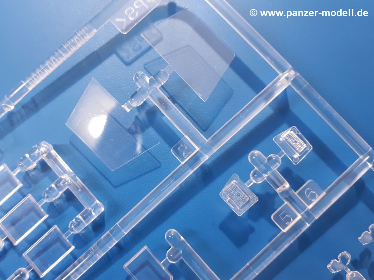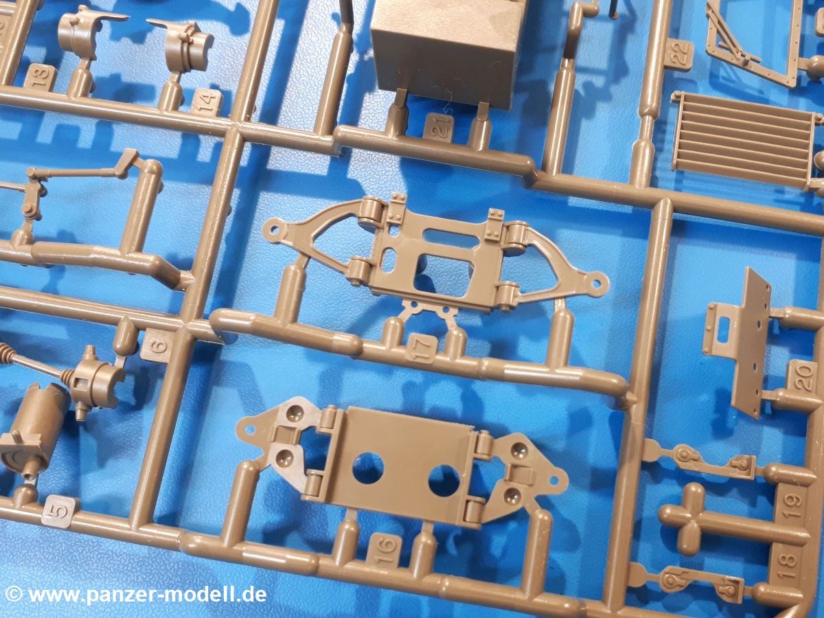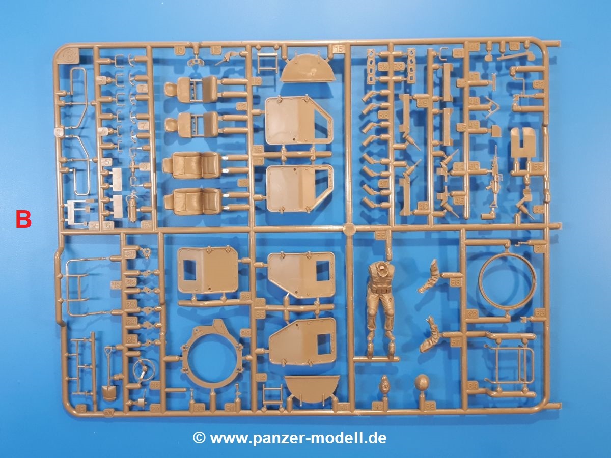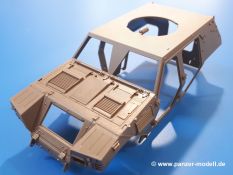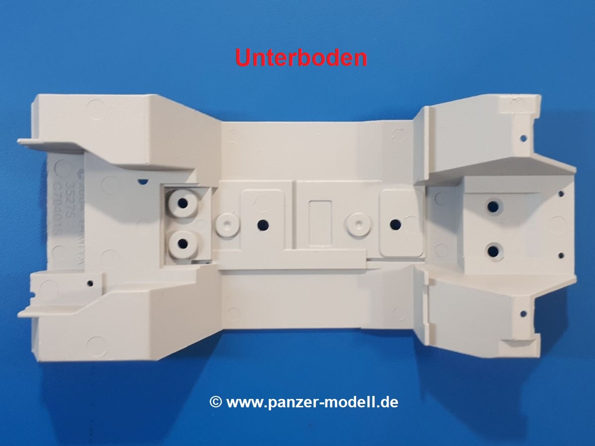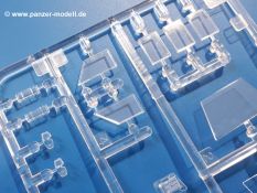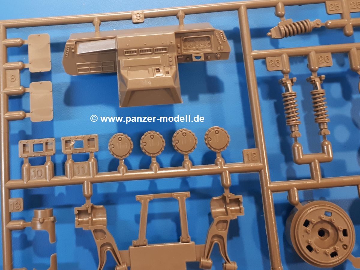 Der Bausatz: Tamiya brachte das LAV (Light Armored Vehicle) bereits 2004 in der Iraq-Version auf den Markt, 2006 mit zusätzlichen Figuren. Die Wiederauflage stellt die Version dar wie sie in Japan genutzt wird. Der Inhalt des 300 x 220 x 55 mm Kartons mit Stülpdeckel besteht aus 3 oliv-grünen Spritzlingen, Karosserie, Unterboden aus Aluminium, Klarsichtspritzling, Spiegelfolie, 4 Gummireifen, 4 Kunststoffmuffen, verschiedenen Schrauben, der Tamiya-typischen 10-seitigen Bauanleitung im Faltblatt-Format und einem 6-seitigen Faltblatt mit Informationen zum Fahrzeug, der Bemalung und Decalvarianten. Tamiya ist bekannt für seine Qualität und schafft es immer wieder, mehrere Teile aus einem Stück herzustellen, ohne an Details einzubüßen. So kommt der Bausatz mit weniger Einzelteilen aus als der vergleichbaren Konkurrenten. Alles ist sauber gespritzt, ohne Sinkstellen, Versatz oder Fischhäute. Einige wenige Auswerferspuren sind zwar zu finden, bereiten aber keine Probleme. Eine Besonderheit des Bausatzes ist der Unterboden aus Aluminium, der dem Modell ordentlich Gewicht verleiht. Baugruppen wie die Mittelkonsole und die Achsen werden mit dem Unterboden verschraubt. Die Schrauben verschwinden dann aber unter Wartungsdeckeln aus Plastik. Andere Teile werden dann mit Sekundenkleber angebracht, da normaler Plastikkleber die unterschiedlichen Materialien nicht zusammenhält. Die beiden Achsen ob ihrer Komplexität mit Einzelradaufhängung, Differential, Kühlrippen, Scheibenbremsen inkl. Bremssattel bestehen trotzdem nur aus wenigen Teilen. Besondere Hingucker die Federbeine. Plastikmuffen in den Radlagern sorgen dafür, dass die Raeder einfach aufgesteckt werden können. In die Felgen aus Plastik wird ein Metallstift eingesteckt, der nicht so leicht bricht wie Plastik und für die Drehbarkeit der Raeder sorgt. Die Reifen aus weichem, schwarzem Gummi sehen mit den Flankenaufdrucken und dem Profil nicht nur echt aus, sie riechen auch so! Der Innenraum ist gut ausgestattet mit Mittelkonsole, Gepäckgestell und Feuerlöscher. Die Rücksitze sind wie im Original etwas spartanisch, dafür sind Fahrer- und Beifahrersitz gut gepolstert, was auch entsprechend gut wiedergegeben ist. Wenn man das Fahrzeug mit Fahrer bauen möchte, setzt man Rumpf, Kopf, Helm und linken Arm zusammen und platziert den Fahrer auf seinem Sitz. Die große Armaturentafel weist bereits viele Schalter und Instrumente auf. Es werden nur noch Wahl-, Blinkerhebel und Lenkrad angebracht. Dann wird die Tafel in die Karosserie eingebaut. Nach Einbau der Scheinwerfer aus Klarsichtmaterial und Anbau der hinteren Schmutzfänger wird die Karosserie mit Sekundenkleber auf das Unterteil geklebt. Danach kann auch der rechte Arm des Fahrers angebracht werden. Der Kühlergrill mit durchbrochenen Lamellen macht ein guten Eindruck. Die Rahmen der Frontscheiben haben bereits angegossene Scheibenwischer. Man kann sie vor Anbringung der Scheiben bemalen. Sämtliche Türen haben sowohl Außen- als auch Innendetails und können geöffnet oder geschlossen gebaut werden. Leider finden sich grad auf den Innenverkleidungen einige Auswerferspuren, die sich aber leicht verspachteln lassen. Der Drehring der Dachluke kann drehbar eingebaut werden. Wie bei den Türen haben die Lukendeckel Außen- und Innendetails für die offene oder geschlossene Bauweise. Je nach zu bauendem Modell kann man zwischen Anbringung der Nebelmittelwurfanlage mit rechtseitigem Antennensockel und Dachreling samt leichtem MG und rückseitigem Antennensockel wählen. Das einzige Außenbordwerkzeug ist eine Schaufel, aber es gibt noch Handgriffe, Anhängerkupplung, Ösen und Außenspiegel anzubauen. Für die Außenspiegel liegt selbstklebende Spiegelfolie dem Bausatz bei. Der Decalbogen enthält neben Feuerlöscherbeschriftung und Typschildern für den Innenraum Decals für 3 Fahrzeuge der japanischen Selbstverteidigungsstreitkräfte :