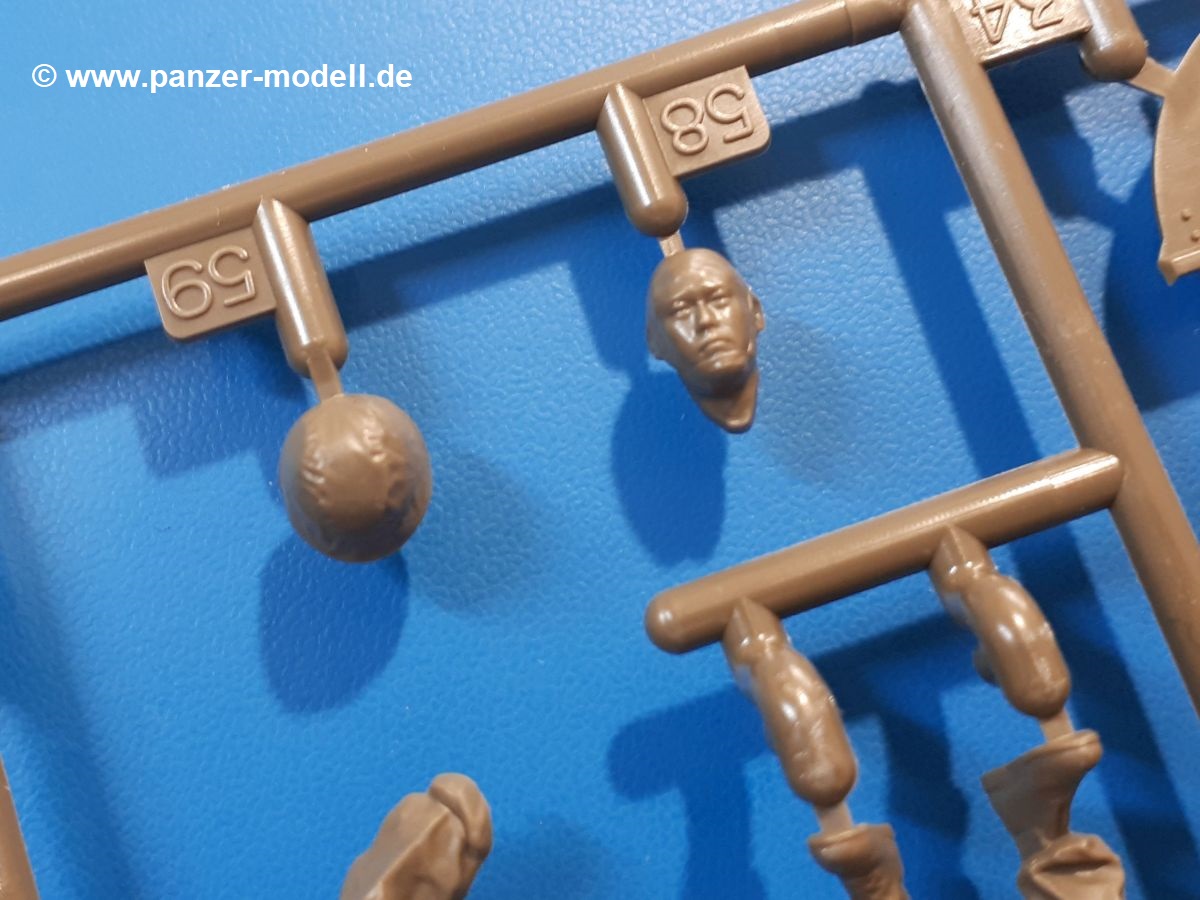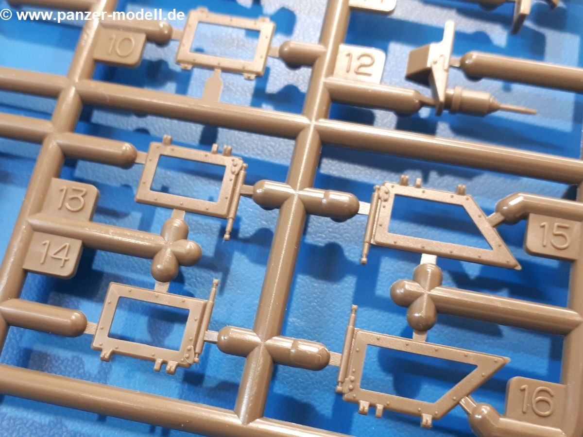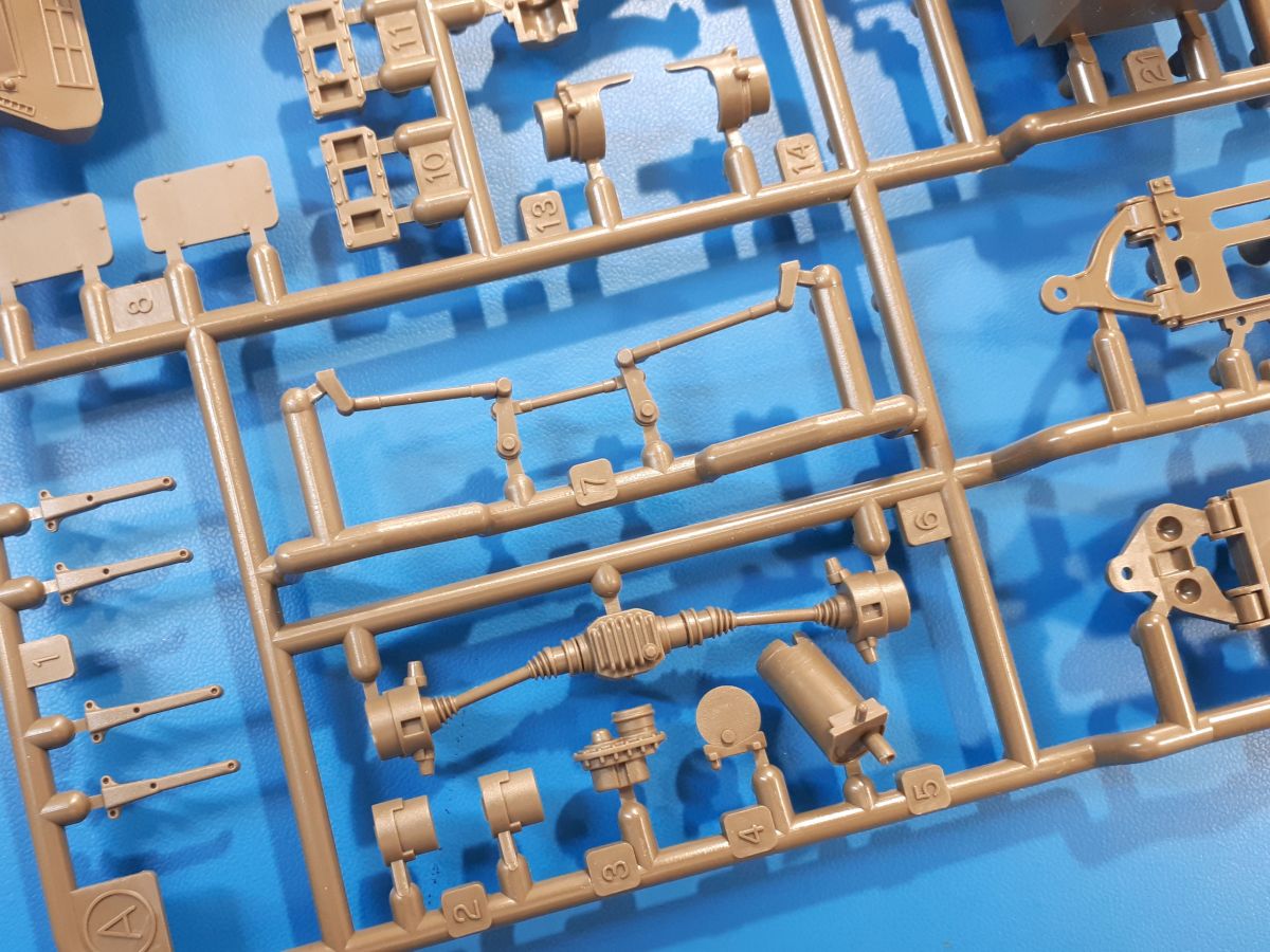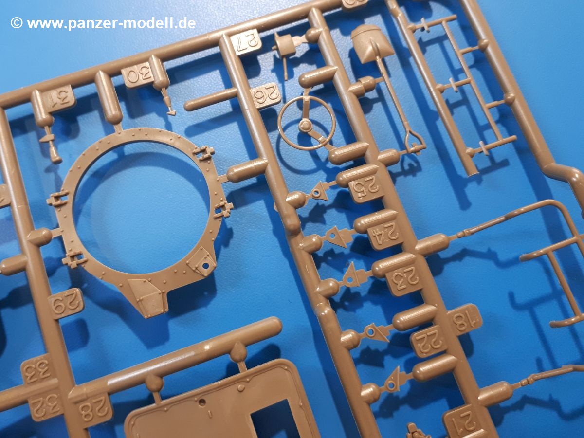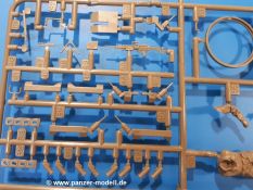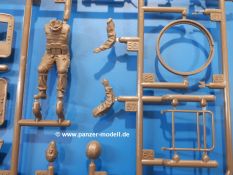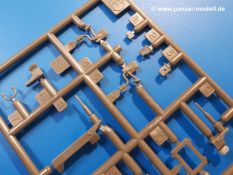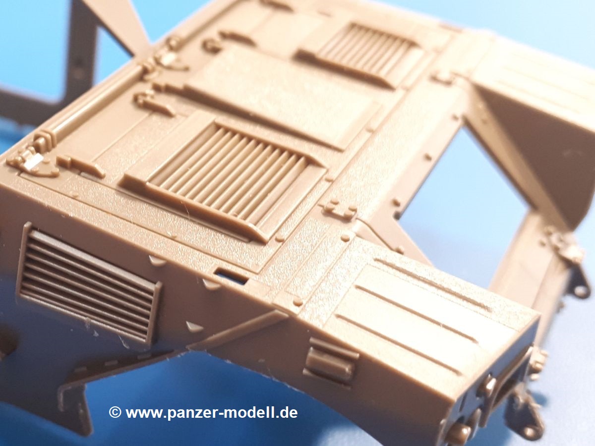 Der Bausatz: Tamiya brachte das LAV (Light Armored Vehicle) bereits 2004 in der Iraq-Version auf den Markt, 2006 mit zusätzlichen Figuren. Die Wiederauflage stellt die Version dar wie sie in Japan genutzt wird. Der Inhalt des 300 x 220 x 55 mm Kartons mit Stülpdeckel besteht aus 3 oliv-grünen Spritzlingen, Karosserie, Unterboden aus Aluminium, Klarsichtspritzling, Spiegelfolie, 4 Gummireifen, 4 Kunststoffmuffen, verschiedenen Schrauben, der Tamiya-typischen 10-seitigen Bauanleitung im Faltblatt-Format und einem 6-seitigen Faltblatt mit Informationen zum Fahrzeug, der Bemalung und Decalvarianten. Tamiya ist bekannt für seine Qualität und schafft es immer wieder, mehrere Teile aus einem Stück herzustellen, ohne an Details einzubüßen. So kommt der Bausatz mit weniger Einzelteilen aus als der vergleichbaren Konkurrenten. Alles ist sauber gespritzt, ohne Sinkstellen, Versatz oder Fischhäute. Einige wenige Auswerferspuren sind zwar zu finden, bereiten aber keine Probleme. Eine Besonderheit des Bausatzes ist der Unterboden aus Aluminium, der dem Modell ordentlich Gewicht verleiht. Baugruppen wie die Mittelkonsole und die Achsen werden mit dem Unterboden verschraubt. Die Schrauben verschwinden dann aber unter Wartungsdeckeln aus Plastik. Andere Teile werden dann mit Sekundenkleber angebracht, da normaler Plastikkleber die unterschiedlichen Materialien nicht zusammenhält. Die beiden Achsen ob ihrer Komplexität mit Einzelradaufhängung, Differential, Kühlrippen, Scheibenbremsen inkl. Bremssattel bestehen trotzdem nur aus wenigen Teilen. Besondere Hingucker die Federbeine. Plastikmuffen in den Radlagern sorgen dafür, dass die Raeder einfach aufgesteckt werden können. In die Felgen aus Plastik wird ein Metallstift eingesteckt, der nicht so leicht bricht wie Plastik und für die Drehbarkeit der Raeder sorgt. Die Reifen aus weichem, schwarzem Gummi sehen mit den Flankenaufdrucken und dem Profil nicht nur echt aus, sie riechen auch so! Der Innenraum ist gut ausgestattet mit Mittelkonsole, Gepäckgestell und Feuerlöscher. Die Rücksitze sind wie im Original etwas spartanisch, dafür sind Fahrer- und Beifahrersitz gut gepolstert, was auch entsprechend gut wiedergegeben ist. Wenn man das Fahrzeug mit Fahrer bauen möchte, setzt man Rumpf, Kopf, Helm und linken Arm zusammen und platziert den Fahrer auf seinem Sitz. Die große Armaturentafel weist bereits viele Schalter und Instrumente auf. Es werden nur noch Wahl-, Blinkerhebel und Lenkrad angebracht. Dann wird die Tafel in die Karosserie eingebaut. Nach Einbau der Scheinwerfer aus Klarsichtmaterial und Anbau der hinteren Schmutzfänger wird die Karosserie mit Sekundenkleber auf das Unterteil geklebt. Danach kann auch der rechte Arm des Fahrers angebracht werden. Der Kühlergrill mit durchbrochenen Lamellen macht ein guten Eindruck. Die Rahmen der Frontscheiben haben bereits angegossene Scheibenwischer. Man kann sie vor Anbringung der Scheiben bemalen. Sämtliche Türen haben sowohl Außen- als auch Innendetails und können geöffnet oder geschlossen gebaut werden. Leider finden sich grad auf den Innenverkleidungen einige Auswerferspuren, die sich aber leicht verspachteln lassen. Der Drehring der Dachluke kann drehbar eingebaut werden. Wie bei den Türen haben die Lukendeckel Außen- und Innendetails für die offene oder geschlossene Bauweise. Je nach zu bauendem Modell kann man zwischen Anbringung der Nebelmittelwurfanlage mit rechtseitigem Antennensockel und Dachreling samt leichtem MG und rückseitigem Antennensockel wählen. Das einzige Außenbordwerkzeug ist eine Schaufel, aber es gibt noch Handgriffe, Anhängerkupplung, Ösen und Außenspiegel anzubauen. Für die Außenspiegel liegt selbstklebende Spiegelfolie dem Bausatz bei. Der Decalbogen enthält neben Feuerlöscherbeschriftung und Typschildern für den Innenraum Decals für 3 Fahrzeuge der japanischen Selbstverteidigungsstreitkräfte :