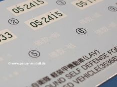 Anfänger lieben sicherlich Tamiya Bauanleitungen, denn sie enthalten alle nötigen Informationen wie benötigte Farben, Werkzeuge (mit Abbildungen davon) und Klebstoffe. Der Zusammenbau wird leicht verständlich in 22 Schritten erklärt. Innerhalb der Schritte wird Detailbemalung angegeben und wann welches Werkzeug und welcher Klebstoff verwendet werden soll. Ebenso wird klargestellt, welche Teile für welche Variante verwendet werden. Schriftliche Erklärungen sind in Japanisch, Englisch, Französisch und Deutsch vorhanden. Das zusätzliche Faltblatt gibt Informationen zum Original in 4 Sprachen. Dazu kommen die Bemalungs- und Markierungsanleitungen für die 3 Fahrzeuge und Farbfotos der Beleuchtungsanlage und des Panzerglases einer Tür. Der gleichartige Basisbausatz kostete vor 15 Jahren noch knapp über 20 Euro. Nun liegt das LAV bei fast 40 Euro. Bei der Qualität liegt der Preis immer noch im Bereich des akzeptablen, wenn er auch Anfänger sicherlich etwas ausbremst.