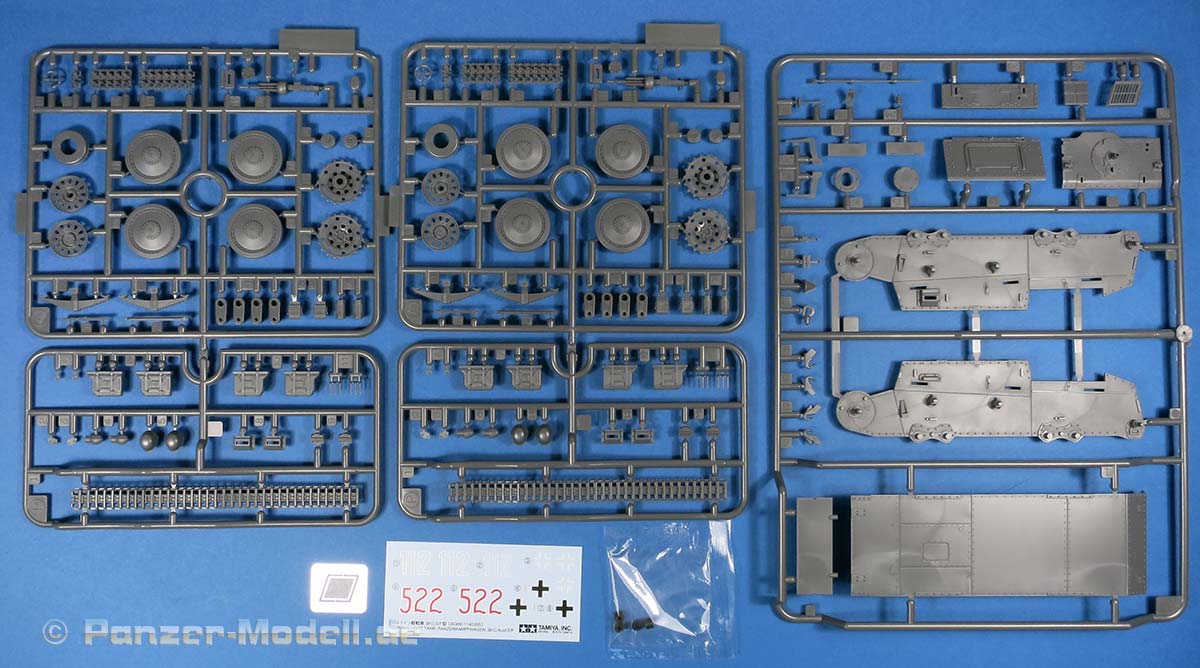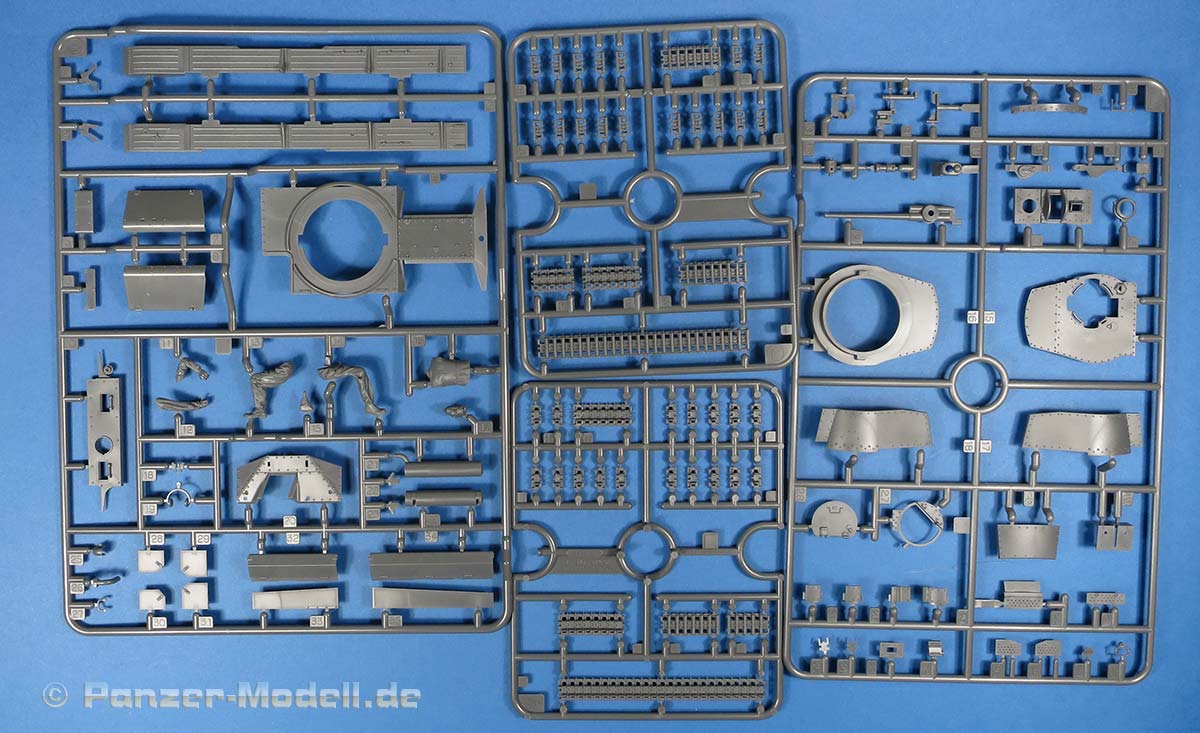 Die Wanne des Panzers setzt sich aus mehreren Einzelteilen zusammen, was aber bei der typischen Passgenauigkeit von Tamiya kein Problem darstellen sollte. Die grundsätzlichen Details sind hier bereits mit angegossen.