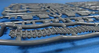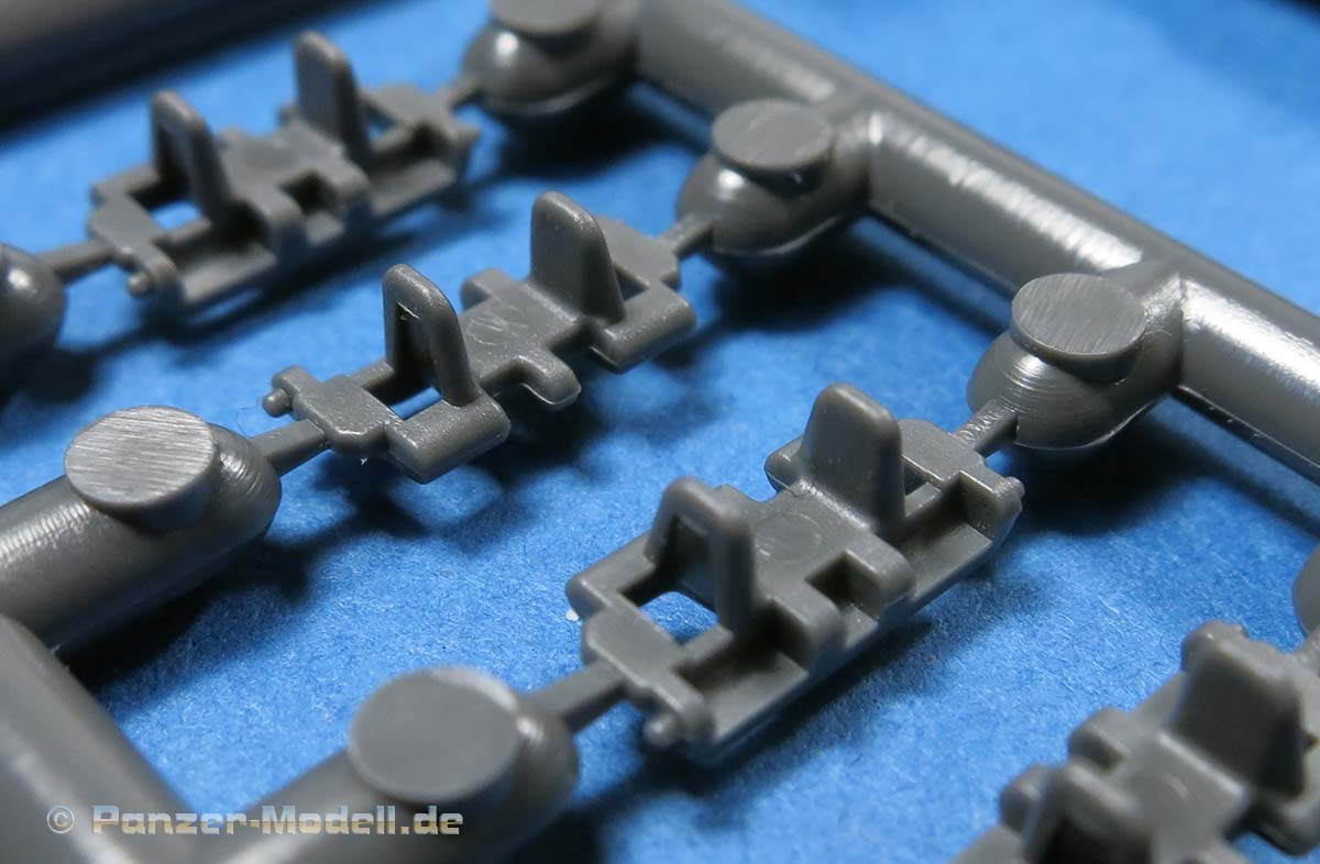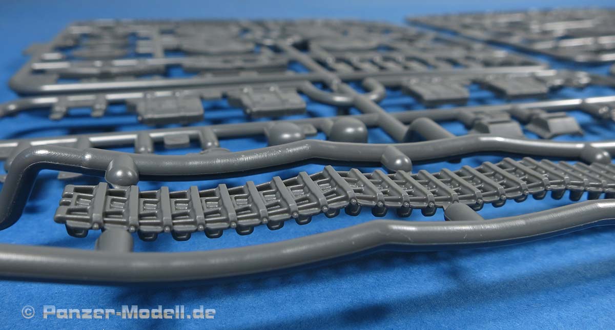 Die neuen Segmentketten sind komplett neu von Tamiya und bestehen aus Einzelgliedern wie auch aus längeren Kettensträngen. Auch hier hält sich der Arbeitsaufwand in Grenzen - nur um Treib- und Leitrad herum muss man einzelne Glieder miteinander verkleben, während die langen Strecken oben und unten bequem als ein Teil dargestellt sind. Tamiya hat den oberen Strängen sogar bereits einen sichtbaren Durchhang verpasst! Sehr schön anzusehen und realistisch gestaltet! Die Qualität der Kettenglieder ist sehr gut, aber auf der Innenseite von einigen finden sich allerdings leider Auswerferstellen, wobei die wirklich schwach ausgeprägt sind und zwischen den Führungszähnen liegen und somit nahezu nicht sichtbar sind