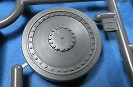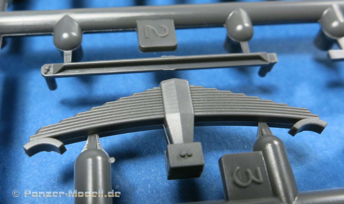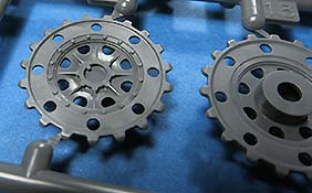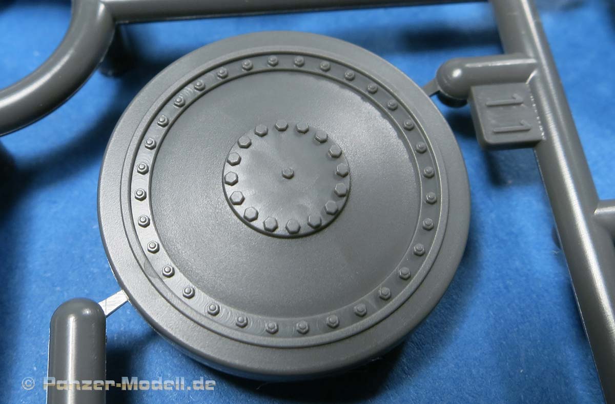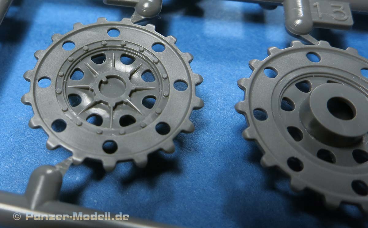 Für das Laufwerk werden pro Laufrollenstation eine Blattfeder mit zwei Kurbelarmen verklebt und bleiben nicht beweglich. Die Laufrollen machen einen guten Eindruck, hier gefallen die feinen Nietenreihen aussen, als auch innen. Die Gummierung weist einen feienn Gussgrat auf, der aber schnell versäubert ist. Die Treibräder setzen sich aus zwei Halbteilen und einem Nabendeckel zusammen und bleiben dank Polycap beweglich, wobei das für die Segmentketten nur noch zweitrangig ist.