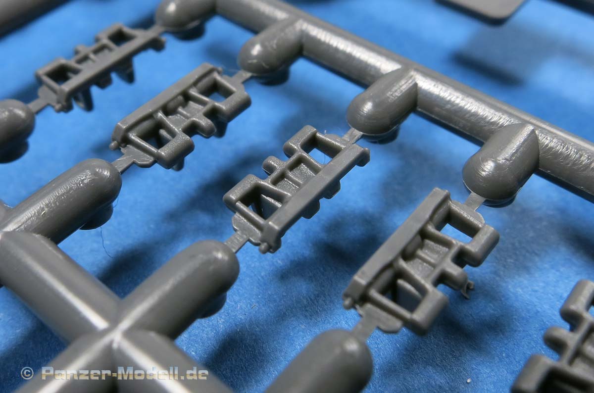 Die Kettenabdeckbleche sind ebenfalls einzeln und gefallen mit ihrer sauberen Art und den feinen Versteifungsrippen. Das Bordwerkzeug liegt einzeln bei mit angegossenen Halterungen und auch die übrigen Kleinteile machen einen sauberen und gefälligen Eindruck. Zur Ausfwahl stehen auch große Staukisten, wie man sie auf einigen Fotos der Panzer 38 finden kann, diese sind versionsunspezifisch und oft an der Ostfront zu finden.
