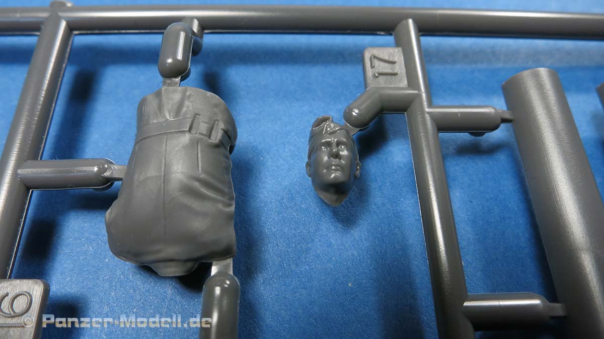 Zur Belebung des Modells hat Tamiya eine Figur beigelegt, die in sitzender Pose auf dem Lukendeckel mit einem Bein in der Luke sitzt. Die Figur weist auch schöne Details auf, wie realistischen Faltenwurf der Uniform und durchaus gut erkennbarem Gesicht.