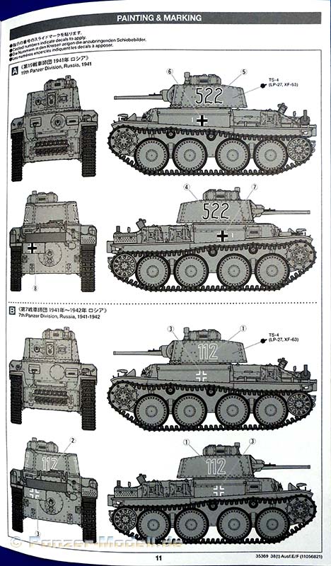 Die Bauanleitung verfügt über 22 Baustufen zum Bau des Modells und der Figur. Tamiya ist nachwievor der Vorreiter für vorbildliche, verständliche und durchdachte Bauanleitungen - so klärt jede Baustufe in hervorragenden Zeichnungen und Zusatzinformationen über das Vorgehen auf. Das Einzige, das ich diesmal anzukreiden hätte ist, dass Tamiya nicht auf die Änderungen zwischen Ausf.E und F eingeht, denn für die F müssten zumindest Nieten an den Lukendeckeln des Motorraums entfernt werden.