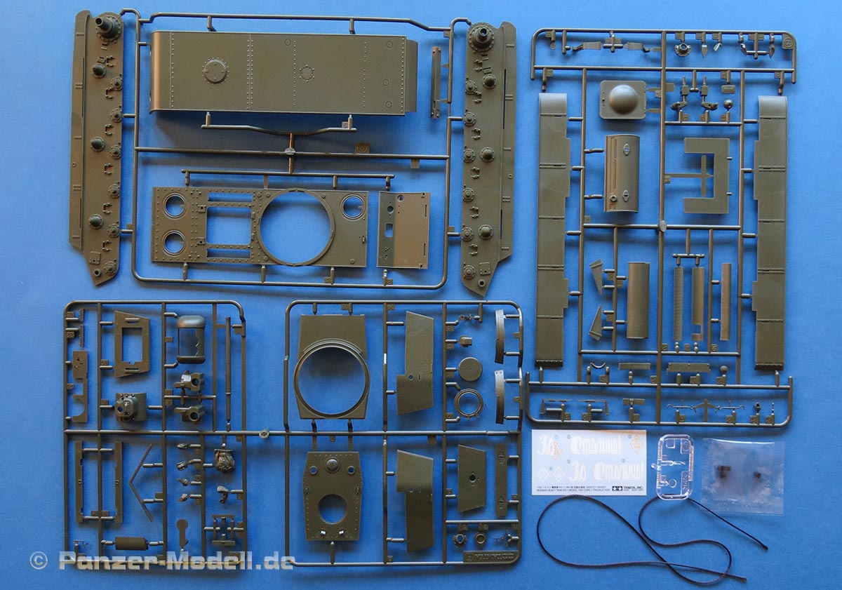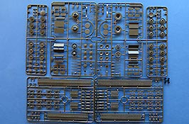 Die einzelnen Spritzlinge sehen tamiyatypisch ausgezeichnet aus. Es finden sich weder Fischhäute noch Grate. Die Auswerferstellen findet man fast nur an später nicht mehr sichtbaren Stellen, die aufgespritzten Details sind fein, wie man sie von Tamiya kennt.