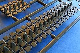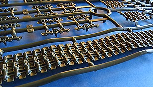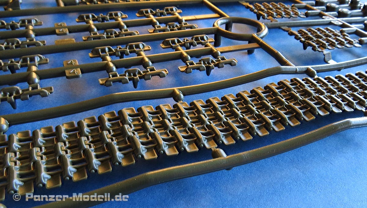 Diese ist von Tamiya sehr gut gelungen. Verschieden lange Segmente und Einzelglieder für die Umläufe und knackscharfen Details. Auf den Innenseiten der Segmente findn sich leider ein paar lästige Auswerferstellen, die sich dort aber gut versäubern lassen dürften oder ggf. durch die Laufrollen gar nicht richtig sichtbar.