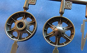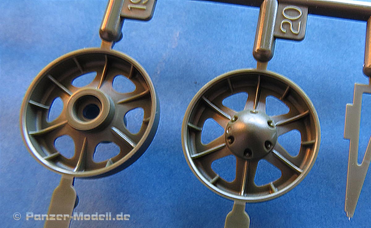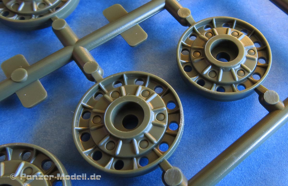 Die Laufrollen, wie auch Treib- und Leiträder setzen sich grundsätzlich aus zwei teilen zuammen, teilweise noch mit einer separaten Abdeckung. Erstaunlicherweise gibt es für die Laufrollen keine Polycaps, sodass diese fest verklebt werden. Die Details der ganze Räder ist sehr gelungen mit feinen Rippen und astrein scharfen Aussparungslöchern.