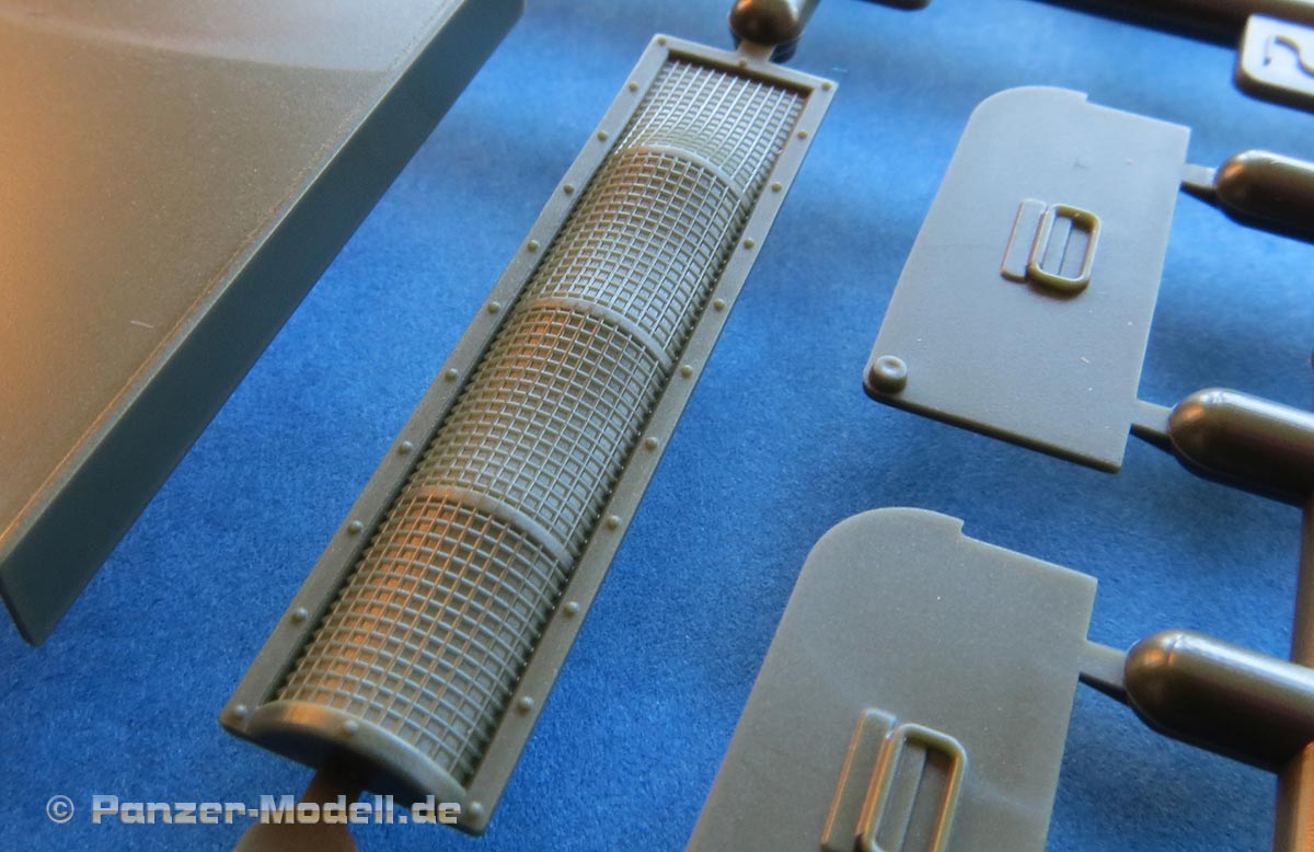 Was mir besonders gut gefällt, ist dass die typischen Staukisten auf den Kettenblechen von Tamiya so beigelegt sind, dass man sie wie gewohnt geschlossen, aber auch offen bauen kann.