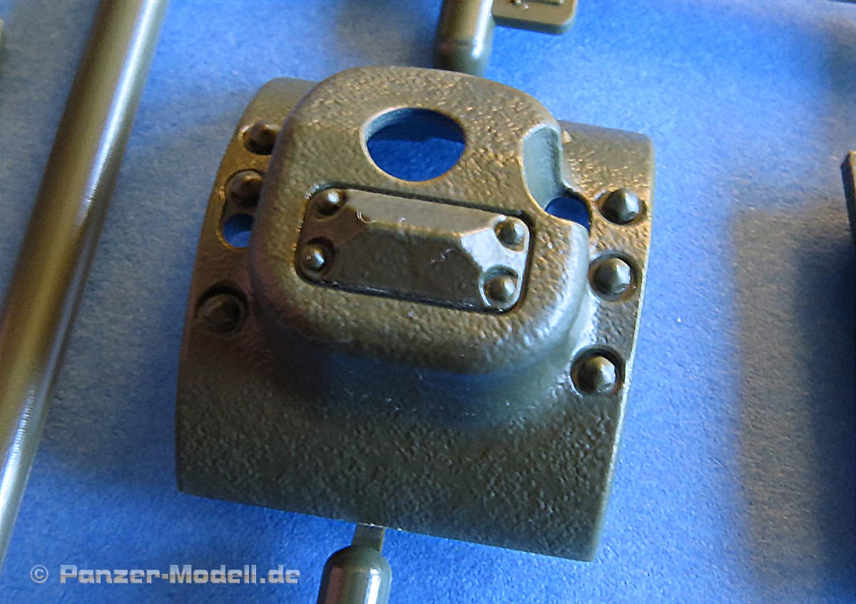 Auch der Turm setzt sich aus vielen Einzelteilen zusammen, was auch wieder problematisch für Anfänger sein könnte, denn jede der Wände muss perfekt zur anderen ausgerichtet werden. Aber ich bin da bei Tamiya guter Dinge, dass das alles gut passt. Auch hier erfreuen uns feine Oberflächendetails wie die Nietenreihern und vor allen die hervorragend gemachte raue Gussstruktur, die wirklich sehr realistisch wirkt.