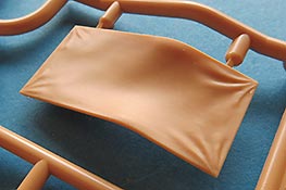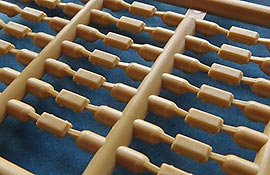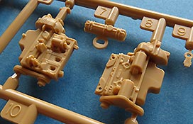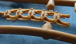 Etwas fieser wird es bei den Ketten - nicht nur dass diese kleiner sind als alle anderen, die man kennt und damit schon eine Herausforderung für Augen und Finger. Zwar wird die Kette aus Segmenten zusammengesetzt, die auch angenehm mit Durchhang gespritzt ist, wo benötigt, aber acuh aus einzelnen Gliedern für die Umläufe an Treib- und Leitrad. Das dürfte schon etwas Fummelei werden. Und damit nicht genug, müssen die winzigen Kettenpolster alle einzeln auf die gerade zusammengebaute Kette geklebt werden. Erfreuliherweise hat Tamiys die Kettenpolster so in Gruppen auf dem Spritzling positioniert, dass man immer mehrere auf einmal auf die Kette kleben kann. Hier ist mit Sicherheit Geduld gefragt - aber die Details der Kettenglieder ist absolut überzeugend.