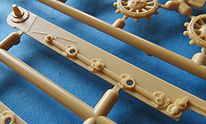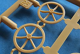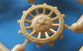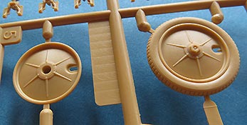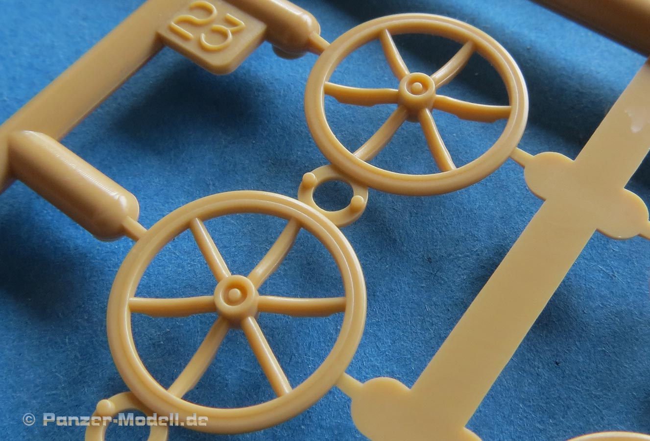 Das Laufwerk mit den überlappenden Laufrollen ist zwar mehrteilig, aber hier wurde ertwas getrickst und die Laufrollen nicht einzeln, sondern mehrere Räder zusammengefasst zum leichteren Anbau. Die Details der Laufrollen sind fein und sauber, auch das Vorderrad ist wirklich fein und sauber detailliert gespritzt.