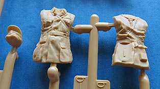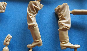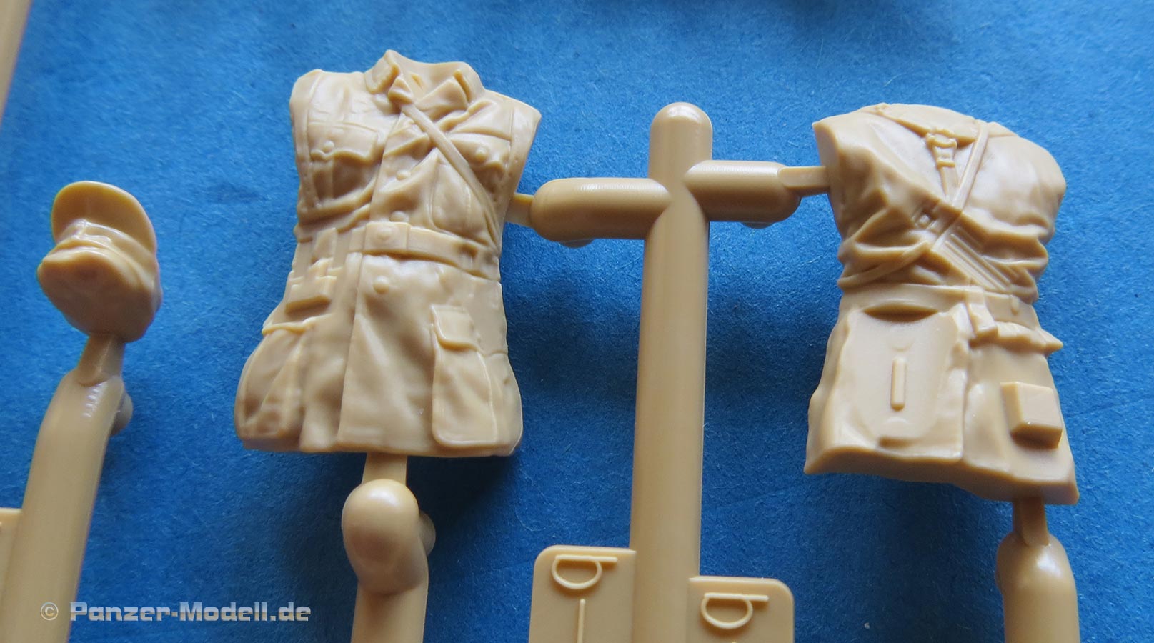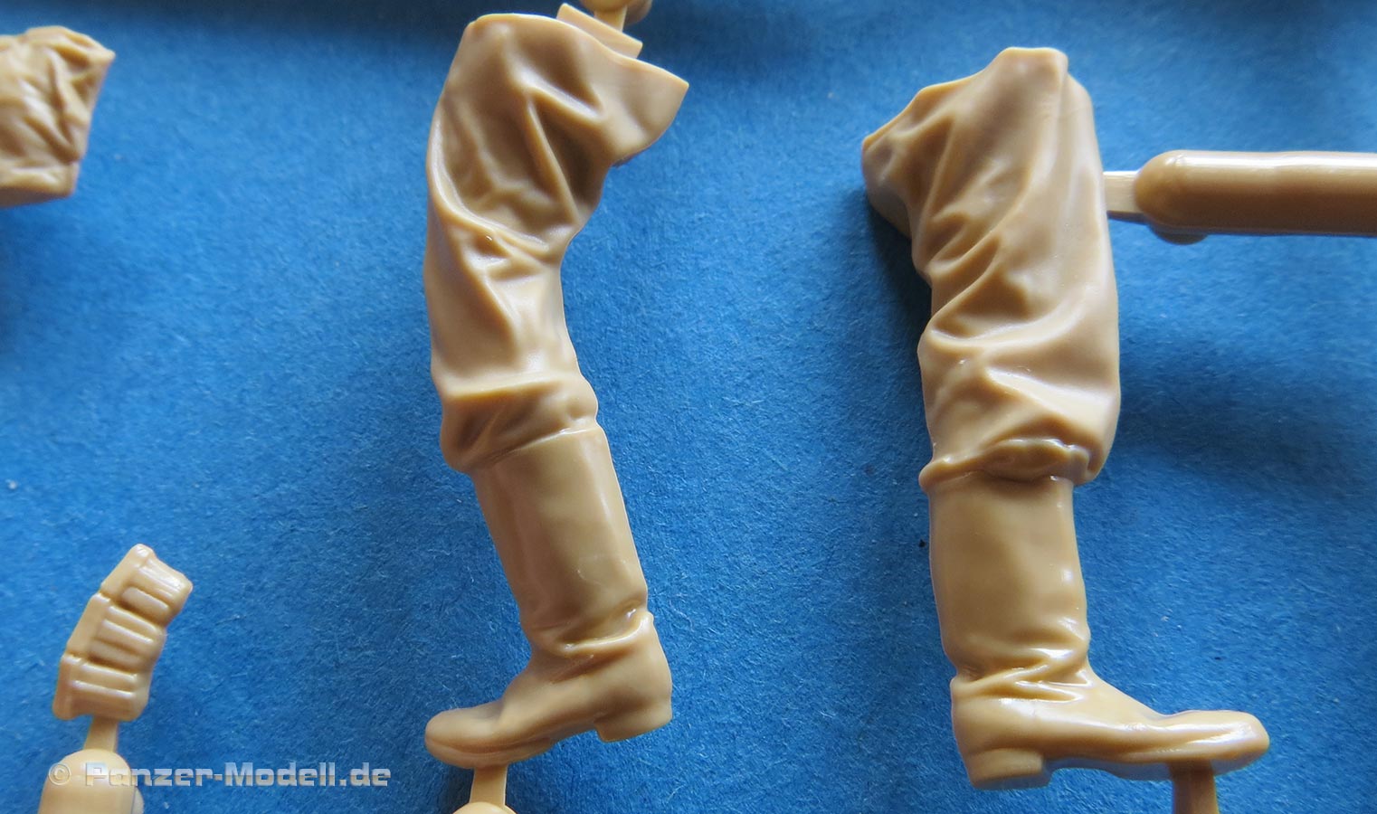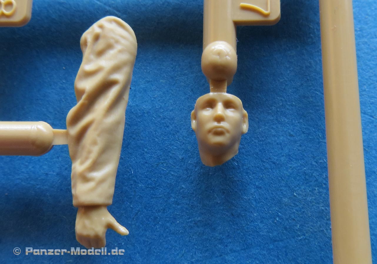 Auch typisch Tamiya ist die Beilegung von passenden Figuren - da ist Tamiya vielen Herstellern immer noch weit voraus. Wir haben hier eine sitzende Figur als Fahrer sowie zwei weitere stehende Infanteristen. Die Qualität der Spritzgussteile ist durchaus sehenswert - die Uniform mit ihren Details und dem Faltenwurf ist schön gepsritzt. Auch die Gesichter sind für SPritzguss wirklich angenehm,