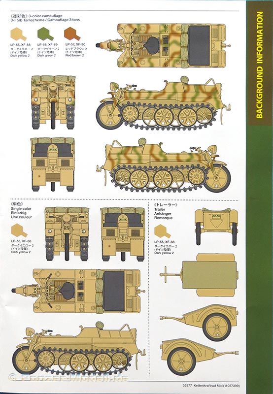 Ein farbig gedrucktes Falblatt zeigt zwei Bemalungsoptionen des Kettenkrads einmal in Dreifarbtarn und einmal einfarbig dunkelgelb. Auch der Sd.Ah.1 wird in der einfarbigen Lackierung gezeigt.